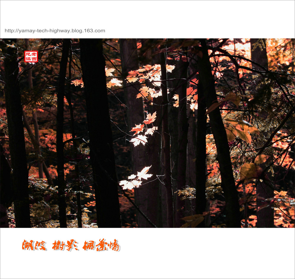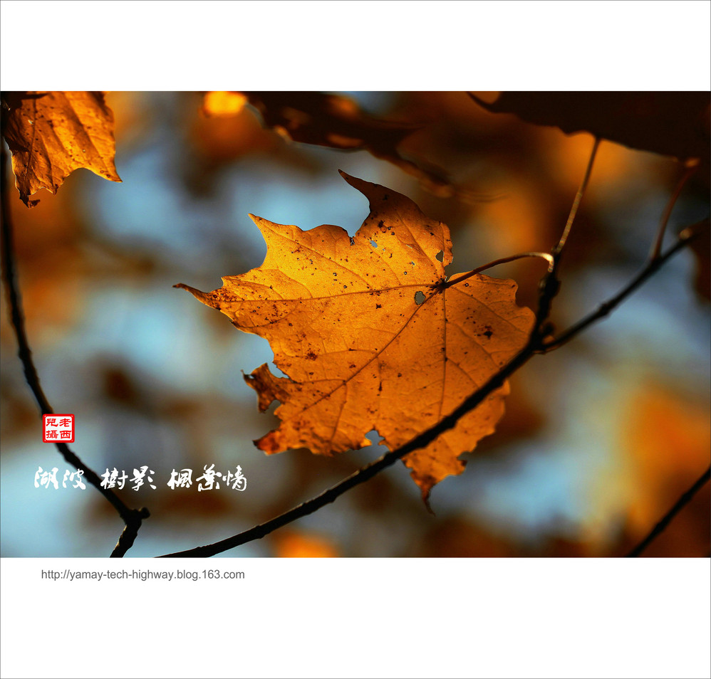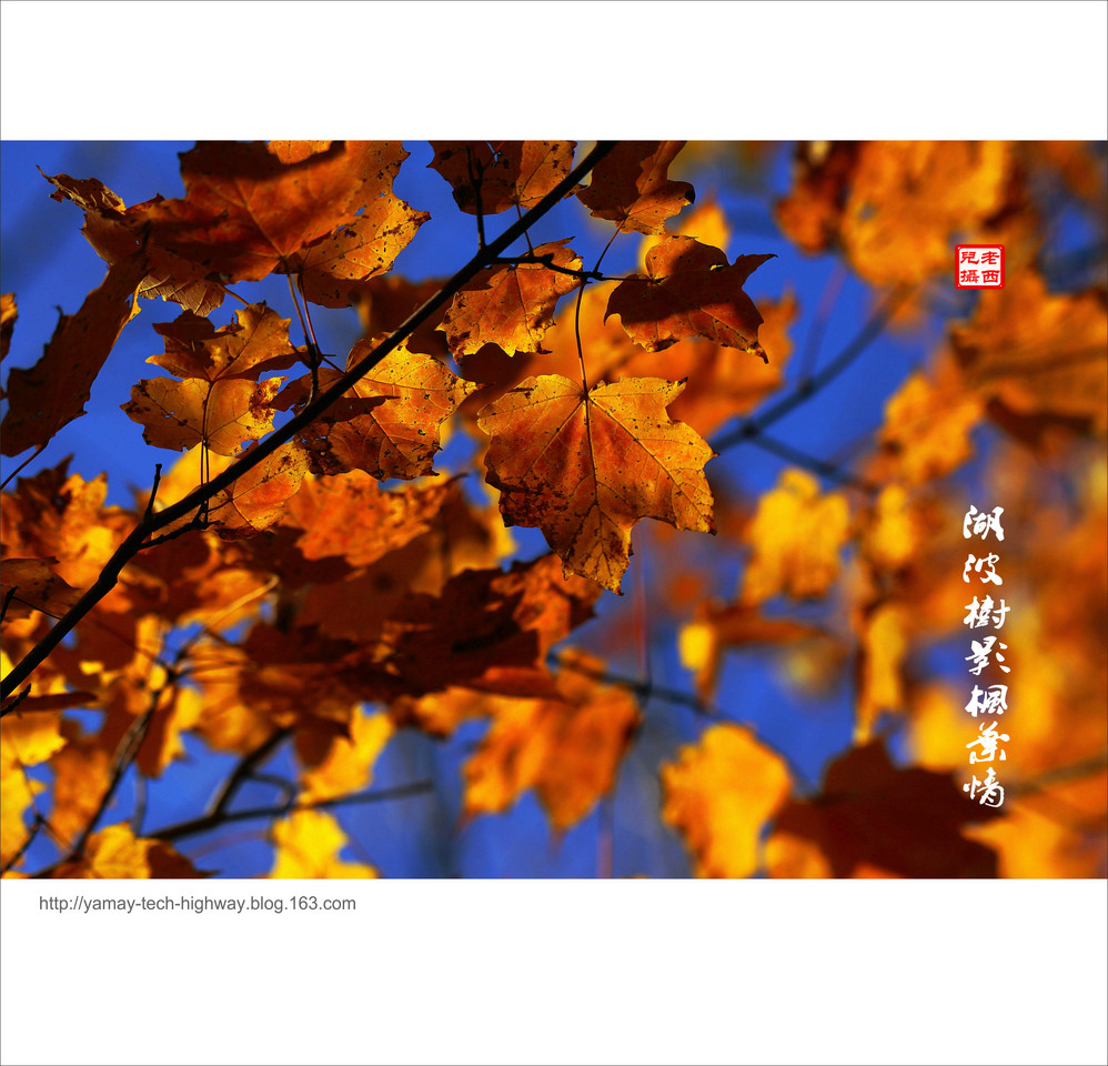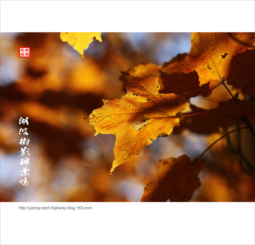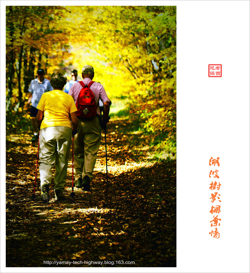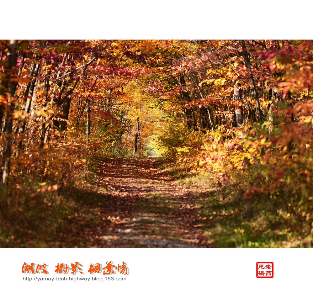因为枫,秋天的加拿大 是最迷人的,随着秋天脚步的临近,昼夜分明的温差使枫树叶渐渐改变了颜色,从城市到原野都笼罩在一片色彩斑斓中,此时的枫树是最浪漫的主角,他们遥迤着一层层火红嫩黄的枫叶,仿佛在诠释着生命的饱满和收获,接着,漆树、黄杨、山毛榉等先后以深红、鹅黄拉开了金秋的序幕;当这些如马赛 克般红的、黄的、橘红的、褐色、金黄的色彩掩映在碧水蓝天之间,你会惊叹于造物主巧夺天工的创造之举,因为想要创造出这样一副栩栩如生的精彩画面,就连最有功底的艺术家也很难一次泼墨成功 。赏枫,永远是金秋人们最爱的活动,无论是轻松惬意的巴士赏枫、自驾车、徒步旅行、还是骑自行车或者泛舟湖上,你都可以通过不同的方式走近大自然的怀抱,一览秋色的湖光山色!多伦多 向北行驶100公里的 Mono Cliffs ,满山遍野的枫树,枝叶如云,层林尽染,如火如荼,黄的泛着灿灿的金光,红的像不灭的火焰……斑斓炫目的色彩,让人目不暇接,我踩踏着满地干枯的枫叶,穿梭于枫林之中,用镜头追逐着枫叶的神韵和激情。高大挺拔的枫树扎根于山石的缝隙,遒劲有力,被霜风染得火红的枫叶,像有着无穷无尽火焰一般澎湃不息的激情在寂寂的山野中蔓延,染红了整片山野,也染红了萧索落寞的深秋;金色的阳光在叶间熠熠闪烁,一幅幅美丽的秋色图让人疑幻疑真。