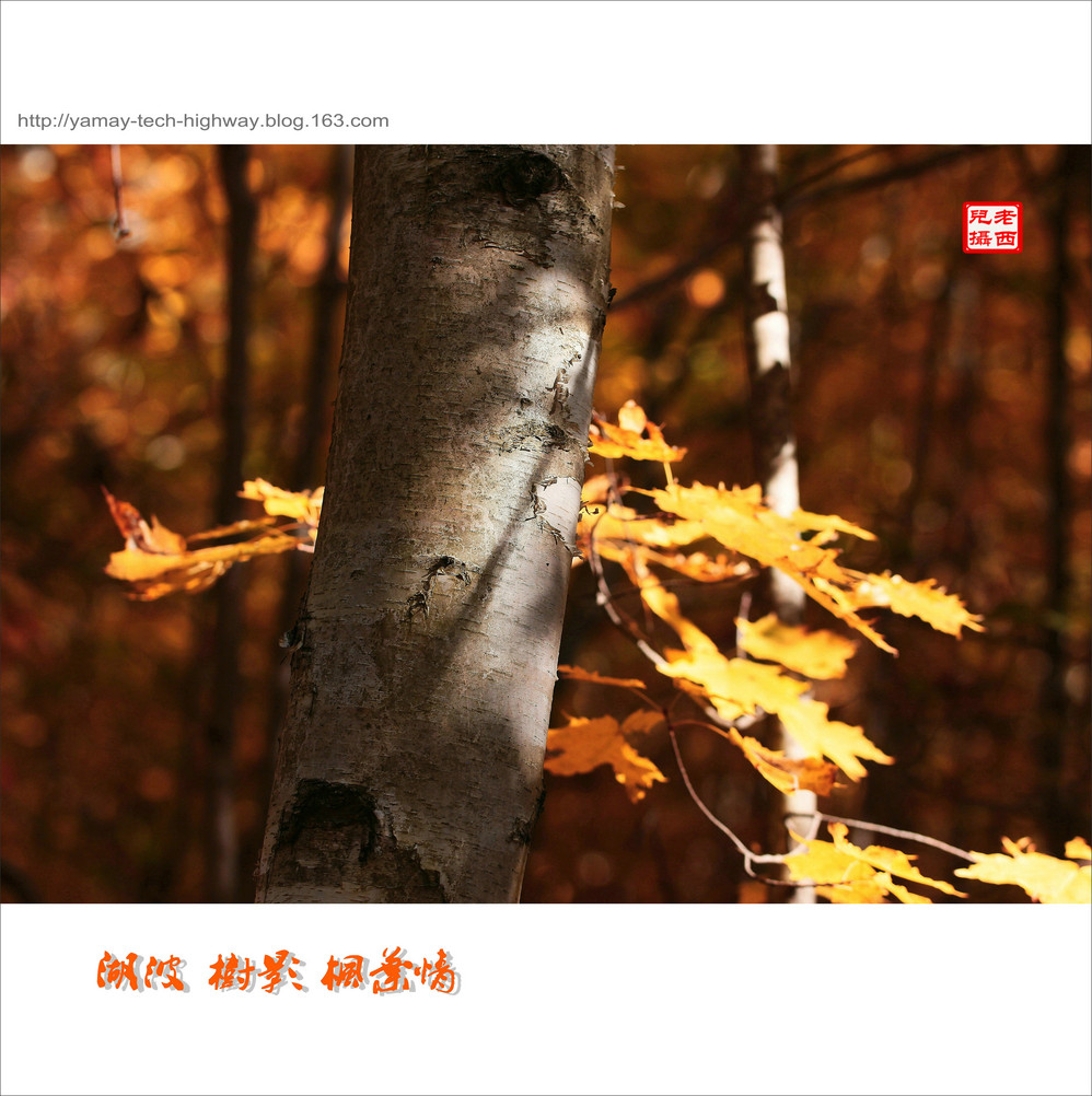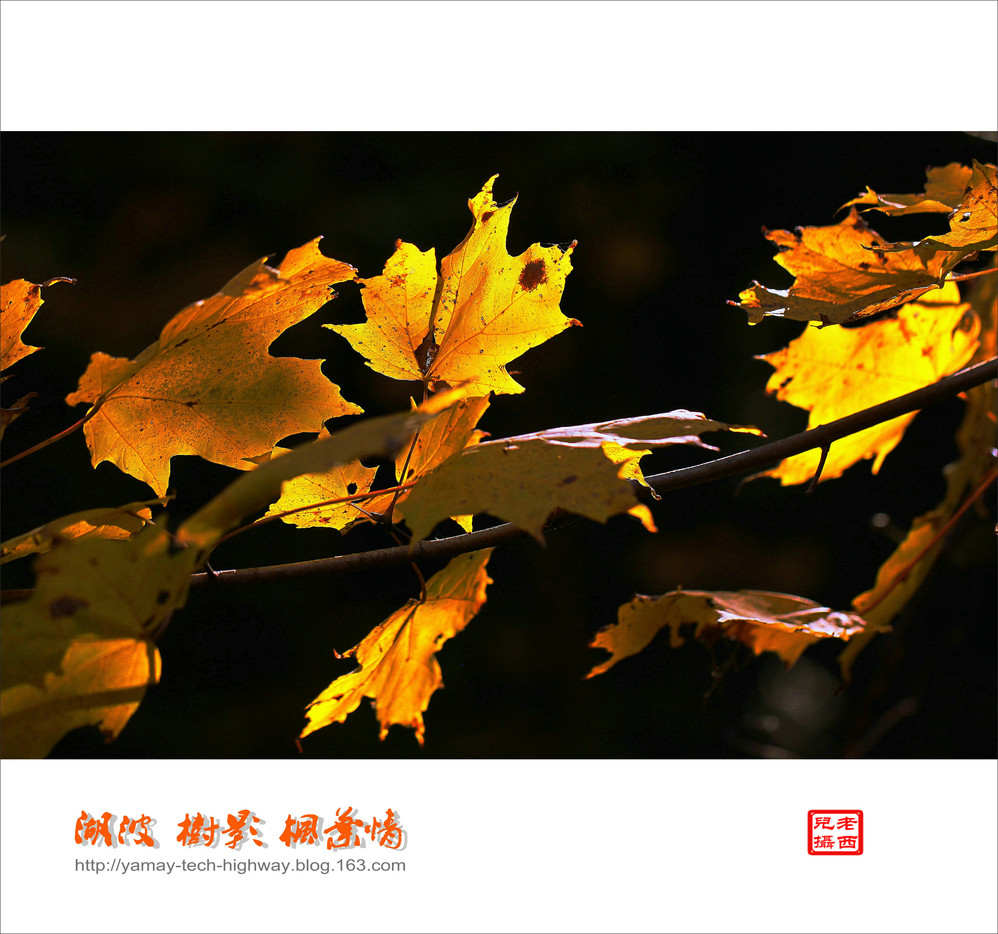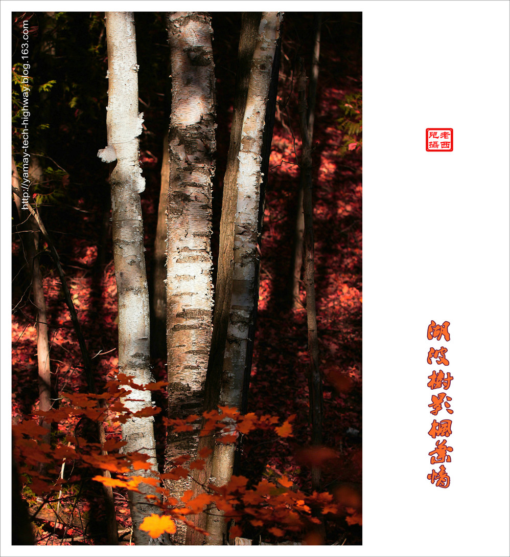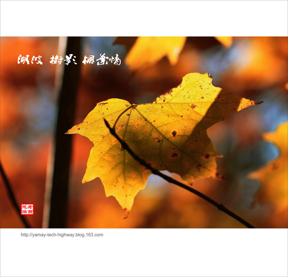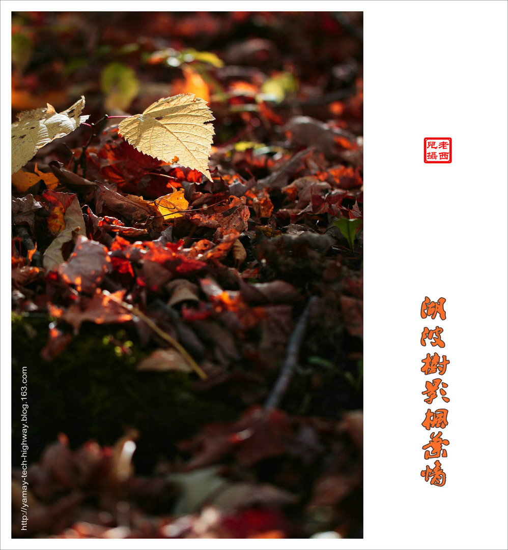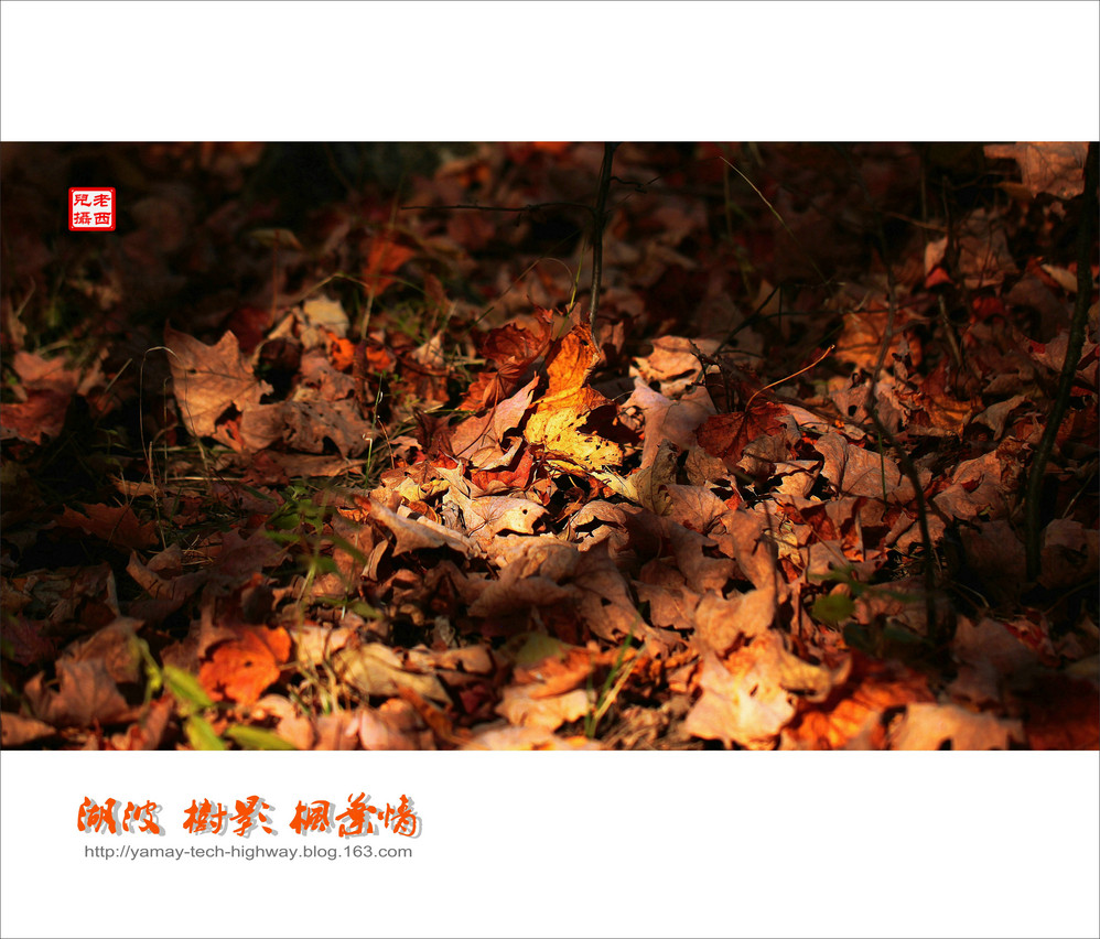 因为枫,秋天的加拿大 是最迷人的,随着秋天脚步的临近,昼夜分明的温差使枫树叶渐渐改变了颜色,从城市到原野都笼罩在一片色彩斑斓中,此时的枫树是最浪漫的主角,他们遥迤着一层层火红嫩黄的枫叶,仿佛在诠释着生命的饱满和收获,接着,漆树、黄杨、山毛榉等先后以深红、鹅黄拉开了金秋的序幕;当这些如马赛 克般红的、黄的、橘红的、褐色、金黄的色彩掩映在碧水蓝天之间,你会惊叹于造物主巧夺天工的创造之举,因为想要创造出这样一副栩栩如生的精彩画面,就连最有功底的艺术家也很难一次泼墨成功 。赏枫,永远是金秋人们最爱的活动,无论是轻松惬意的巴士赏枫、自驾车、徒步旅行、还是骑自行车或者泛舟湖上,你都可以通过不同的方式走近大自然的怀抱,一览秋色的湖光山色!多伦多 向北行驶100公里的 Mono Cliffs ,满山遍野的枫树,枝叶如云,层林尽染,如火如荼,黄的泛着灿灿的金光,红的像不灭的火焰……斑斓炫目的色彩,让人目不暇接,我踩踏着满地干枯的枫叶,穿梭于枫林之中,用镜头追逐着枫叶的神韵和激情。高大挺拔的枫树扎根于山石的缝隙,遒劲有力,被霜风染得火红的枫叶,像有着无穷无尽火焰一般澎湃不息的激情在寂寂的山野中蔓延,染红了整片山野,也染红了萧索落寞的深秋;金色的阳光在叶间熠熠闪烁,一幅幅美丽的秋色图让人疑幻疑真。