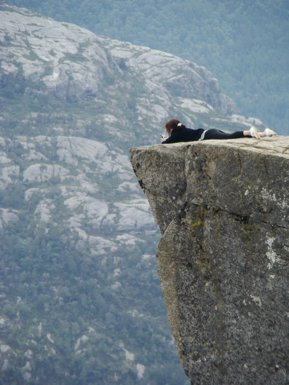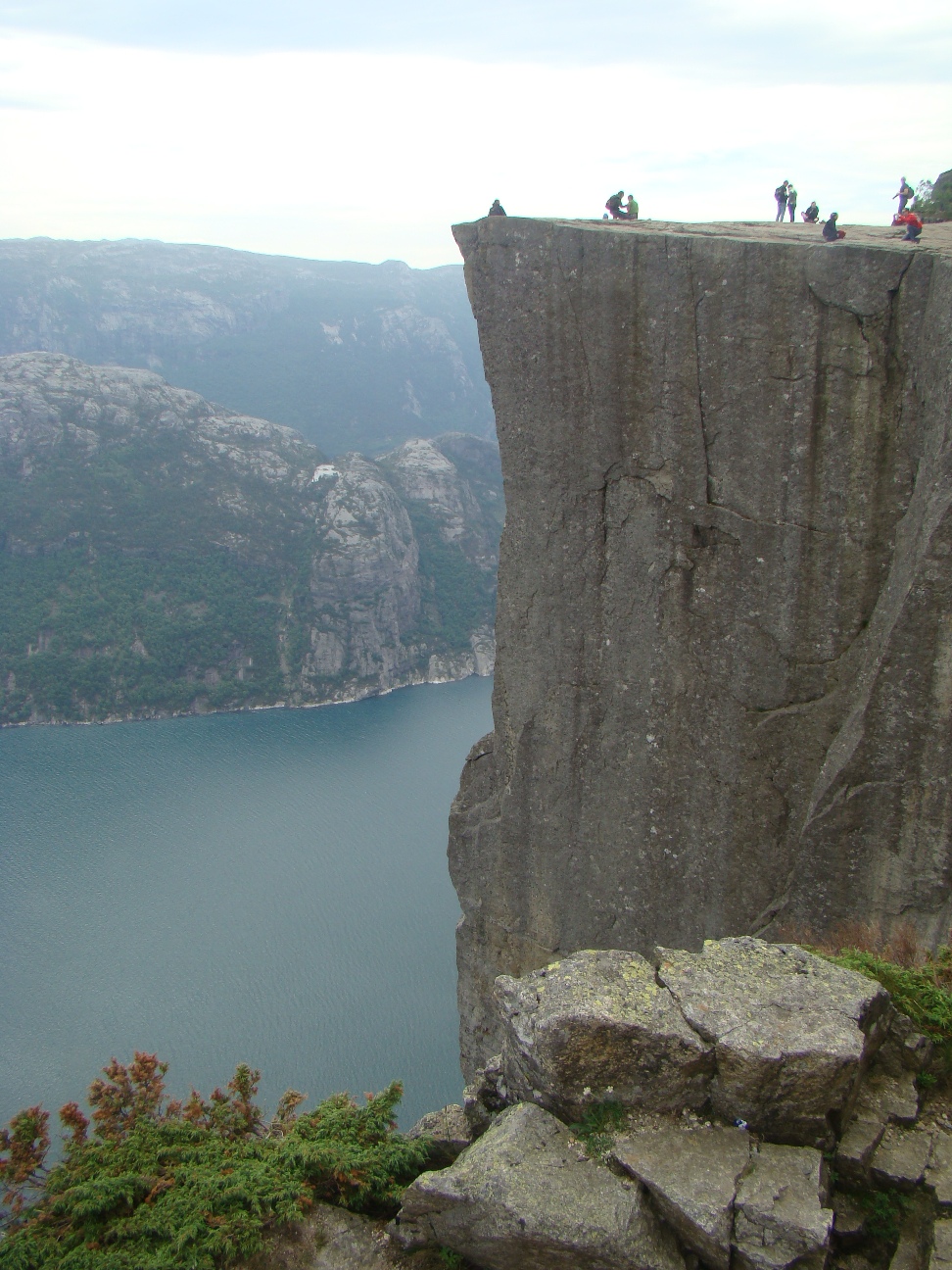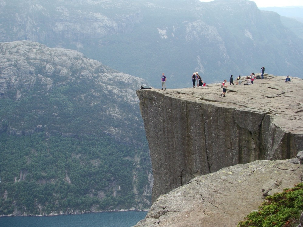 崖顶平台24米见方可容几百人,可以一步一步胆战心惊地挪到巨石的平顶边缘,观赏600米陡峭的悬崖下的吕瑟峡湾。