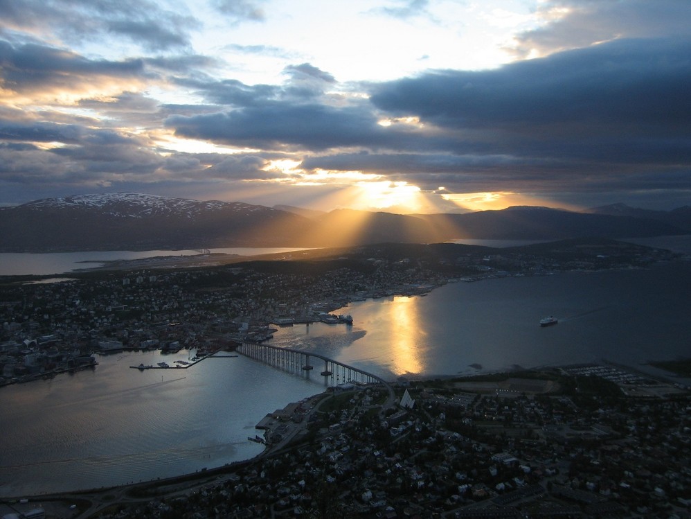 我们抵达特罗姆瑟是7月6日,刚过夏至不久,在北极圈内的特罗姆瑟可以观赏到整天不落的太阳,即使在午夜也可以看到太阳,感受到没有黑夜的一天,正是奇妙的极昼景观。下面是午夜零点前后拍的照片,没有用闪光灯。