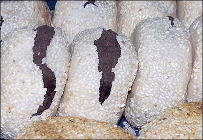 蛤蟆吐蜜(豆陷烧饼) 豆陷烧饼是北京 小吃中的常见品种,因其以豆沙为馅而得名,在烤制过程中,因烧饼边上有自然开口,吐出豆馅,挂着烧饼边上,所以人们就形象地称这种烧饼为蛤蟆吐蜜。
