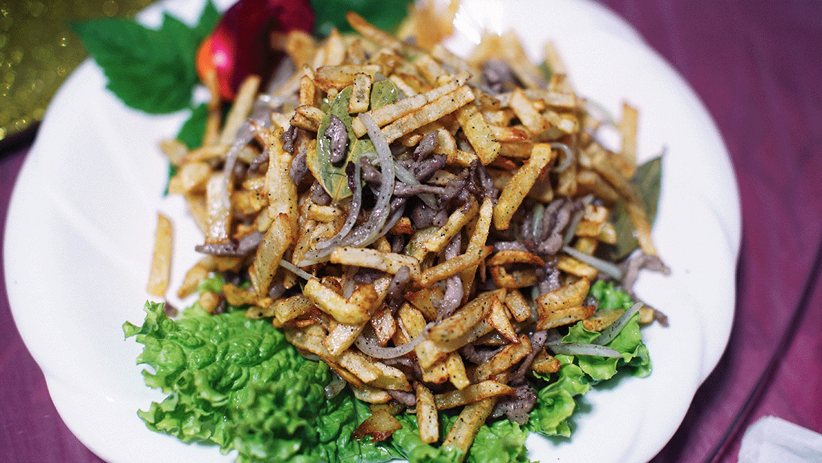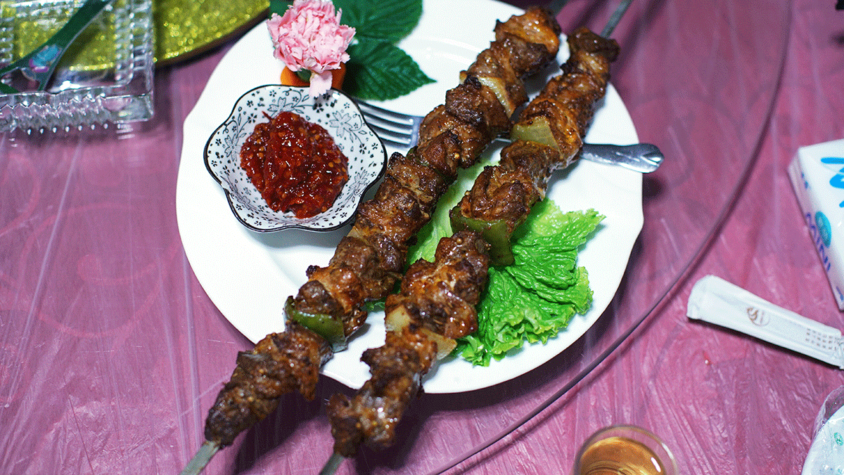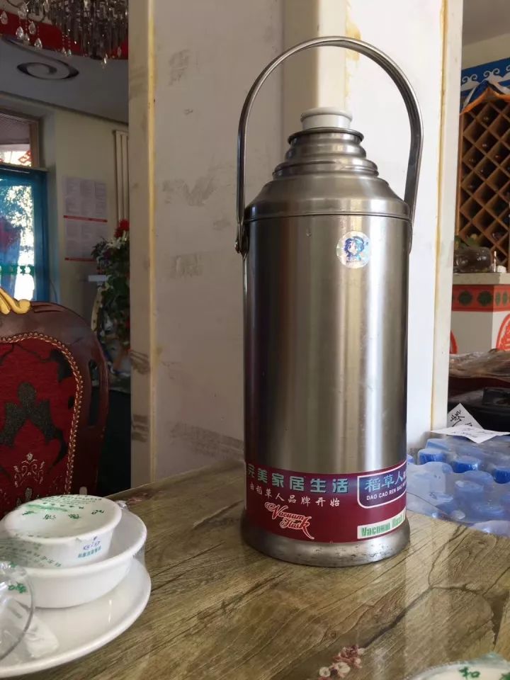 饮食的话,只有一个建议,出发前多吃点蔬菜水果吧。这里的饮食主要分三种:涮肉、烧烤、铁锅炖。刚开始羊肉还吃得不亦乐乎,三五天之后,你会希望自己是一只会吃草的羊。而且菜的分量巨大,两个人点两个菜,基本吃不完。有一次,我们叫老板来一壶水吧,然后:
