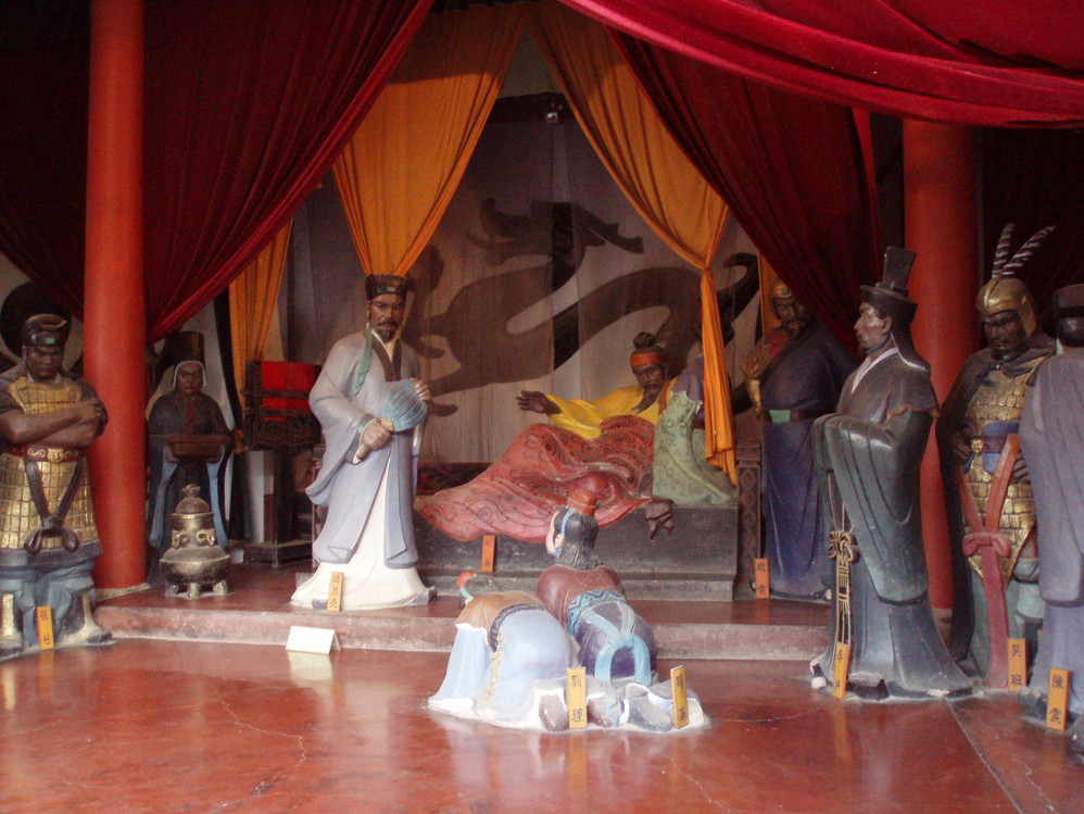 三国时,刘备兵败退至白帝城,无颜会见群臣,于是在白帝城修建了永安 宫安居,不久郁闷而死,临死前刘备把政权和儿子刘禅托付给丞相诸葛亮,史称“刘备托孤”。至明朝,公孙述的塑像被搬开,为刘备像所代替。庙内还有关羽、张飞、诸葛亮的塑像,但“白帝庙”的名称一直沿用至今。现白帝城内的白帝庙中塑有刘备托孤的彩色群像,其艺术再现了当时刘备托孤之情景,白帝庙由最初祭祀公孙述,成了祭祀蜀汉君臣刘备、诸葛亮、关羽、张飞的地方,几经变易,现出土文物陈列室里展示着自新石器时代到清代六七千年间,在白帝城一带出土的文物数百件,新近又落成《杜甫行吟》大型瓷画。