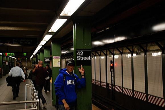 偶的第一站是位于7道42街的时报广场。(顺便提一句,XX说这个季节在纽约 适合穿hoodie,但翻箱倒柜,发现只有一件Duke的hoodie,就傻模傻样的披上了,但这件hoodie,不,确切的说是hoodie上这四个字母,却为我的纽约 行程增色不少,在后文中我会略有提及。)