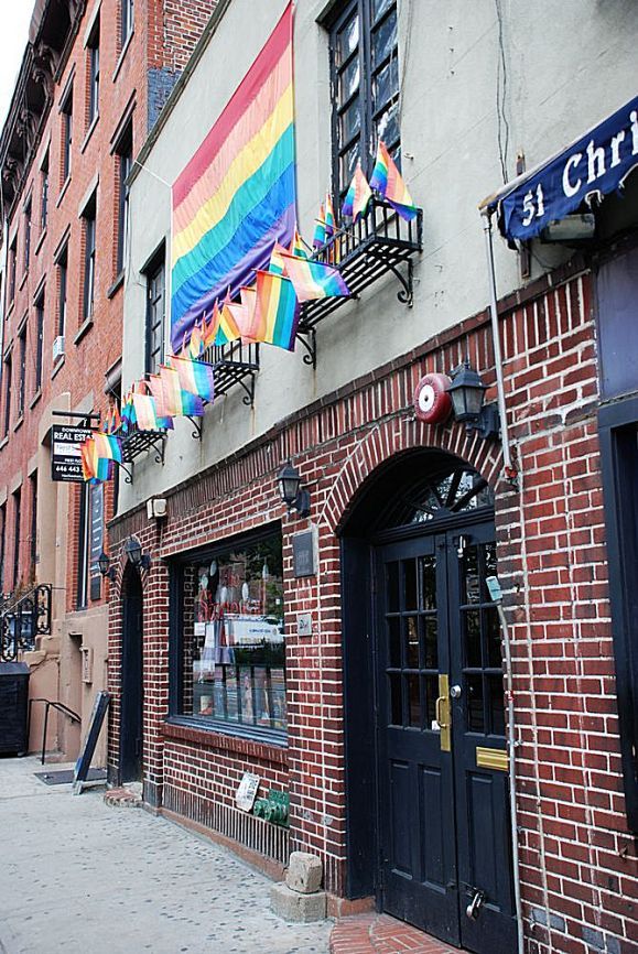 坐落在Christopher街上有间酒吧,门外插着的代表同性恋彩色小旗。它就是爆发著名石墙事件的Stonewall Inn。