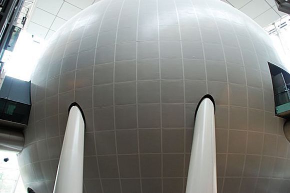 二层半的这个球体是天文馆的放映厅,里面可以看一部有关太阳系的起源的电影,球型的屏幕在观众的正上方,所以全场是要仰着头看的。内容都是些不太复杂的概念,中子星啊,白矮星之类的,但视觉效果还不错。