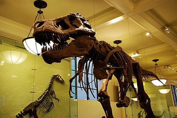 老爷爷指着他正前方的Tyrannosaurus说:看这家伙的牙齿,他可是吃肉的,如果他邀请你去参加晚宴,你可千万别去。然后老爷爷指着暴龙那双已经退化了的前肢说:his hands cannot do anything。看着暴龙这及其不协调的身躯(硕大的后肢和几乎可以忽略的前肢),我问老爷爷:那这家伙是怎么维持平衡的呢?就靠他的两只脚?有兴趣的童鞋可以继续猜老爷爷的回答。哈哈。。。