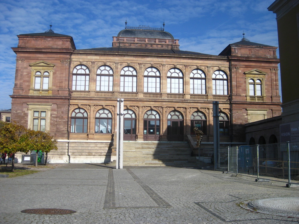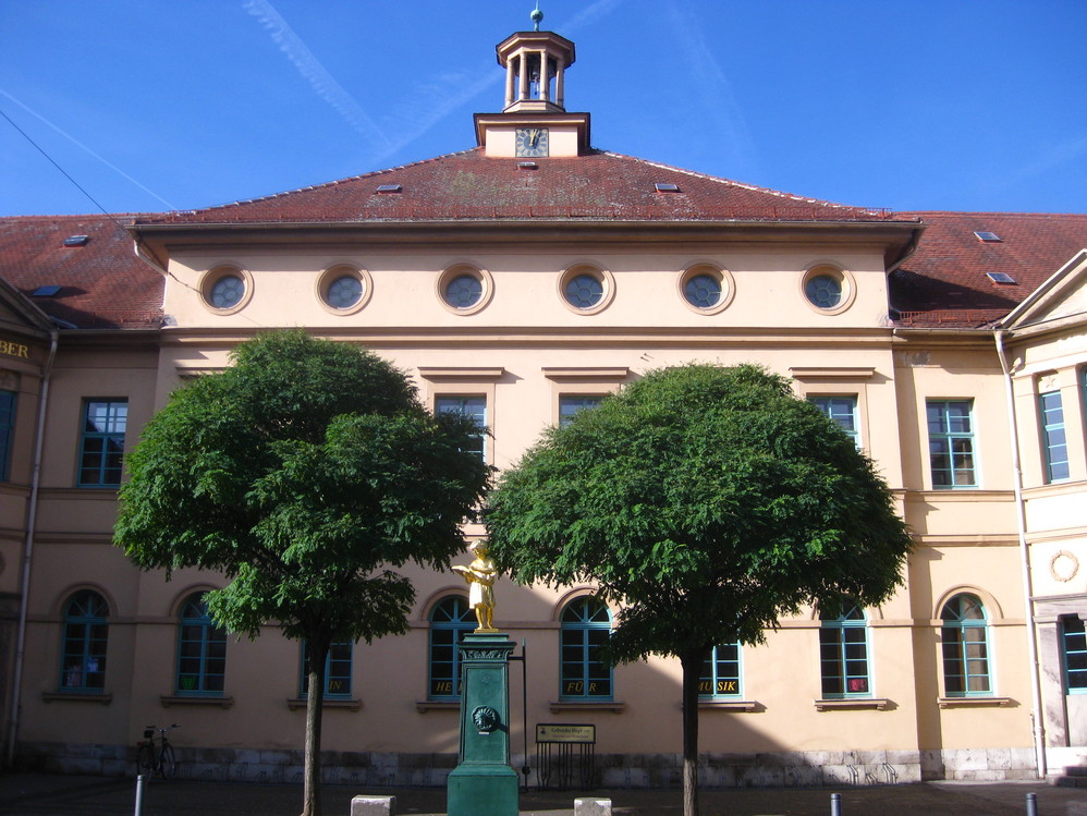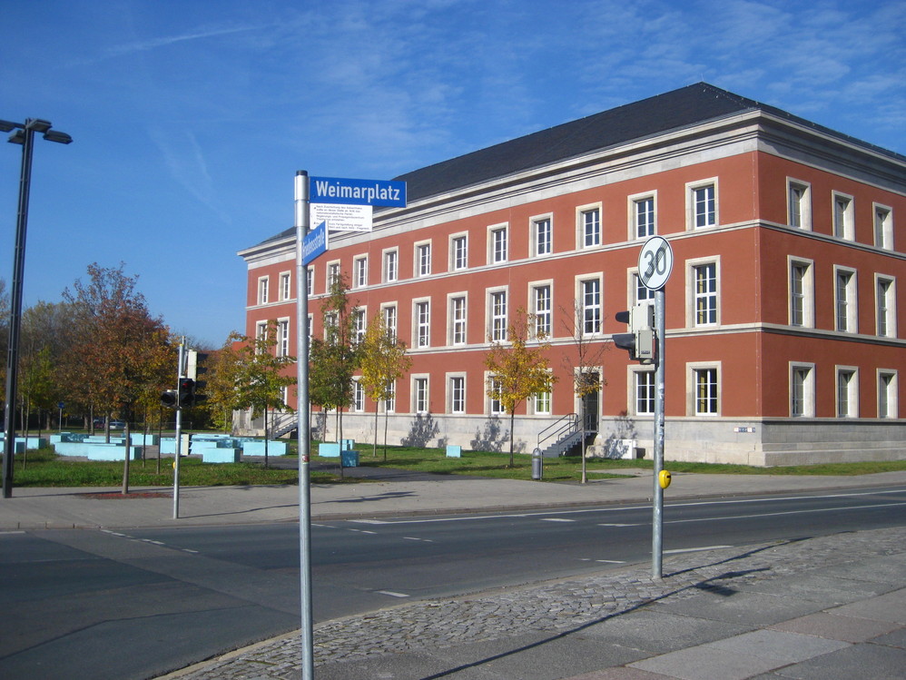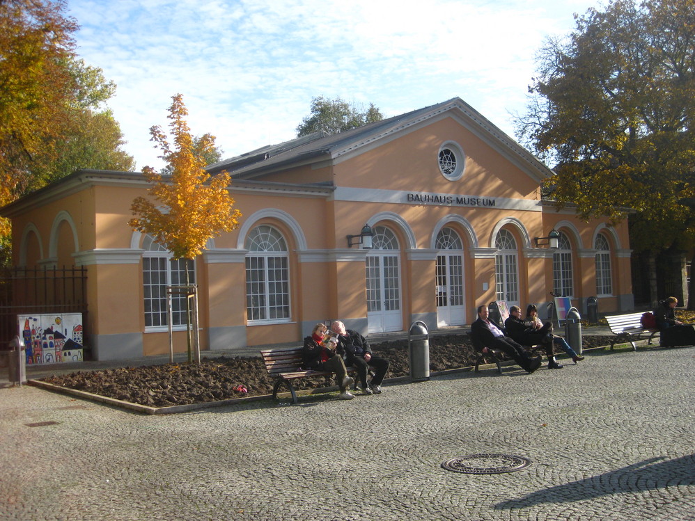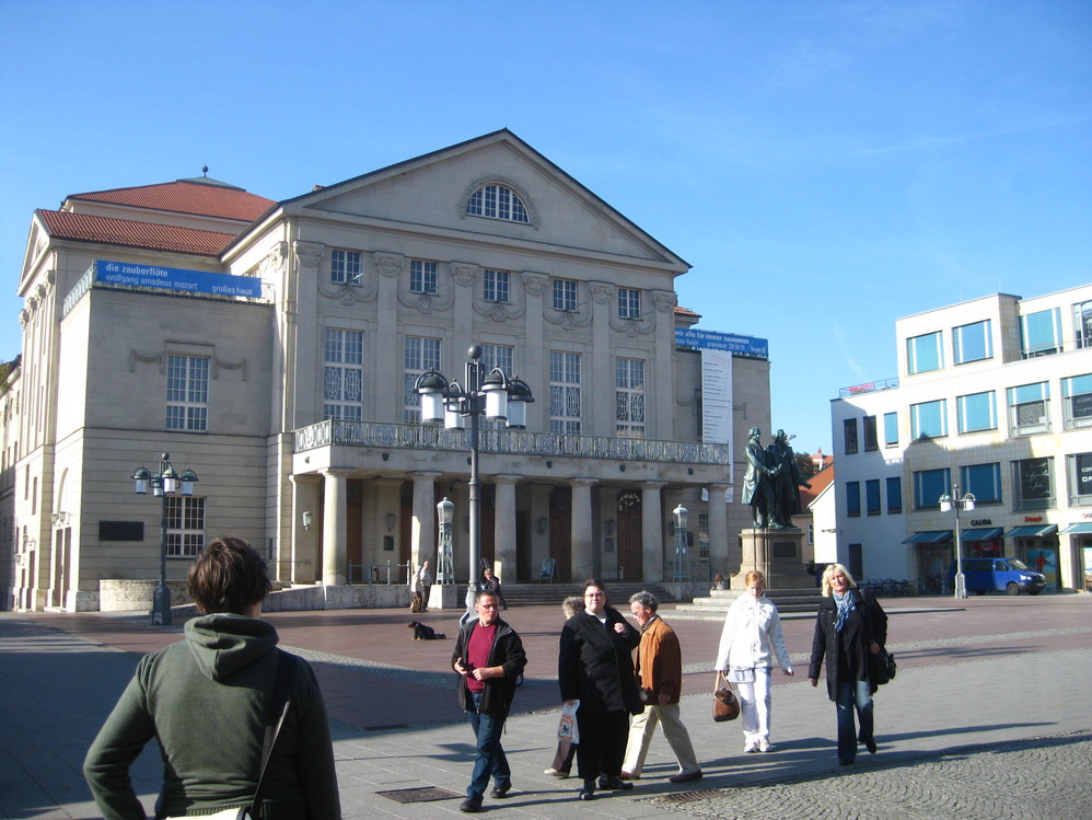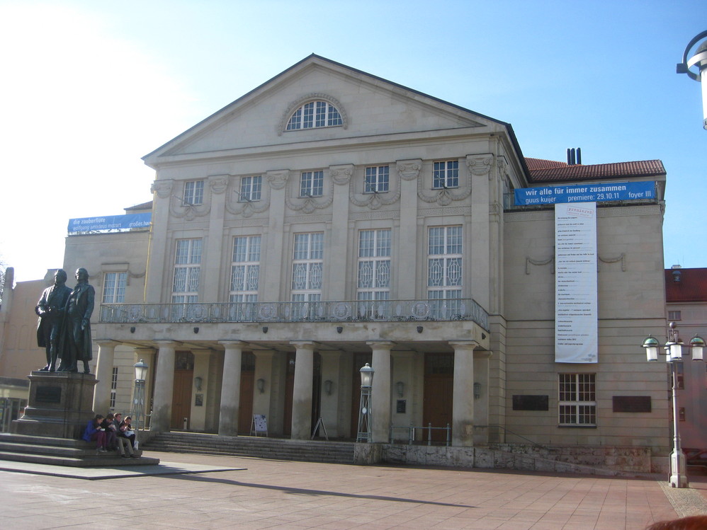 包豪斯博物馆对面的剧院广场。德国 国家剧院在剧院广场,门口是歌德和席勒的纪念像。这座建筑早在1779年就作为魏玛 宫廷剧院建造。1907年由于建筑安全期原因被拆除,1908年新建 了一个新古典主义建筑 。 歌德曾经是宫廷剧院经理。好几个重要的政治会议 也在这里召开,如1919年的魏玛 共和 国的建立。今天这栋建筑里包含有图林根 剧院和魏玛 国家管弦乐 团。