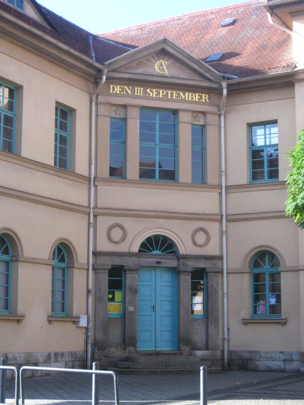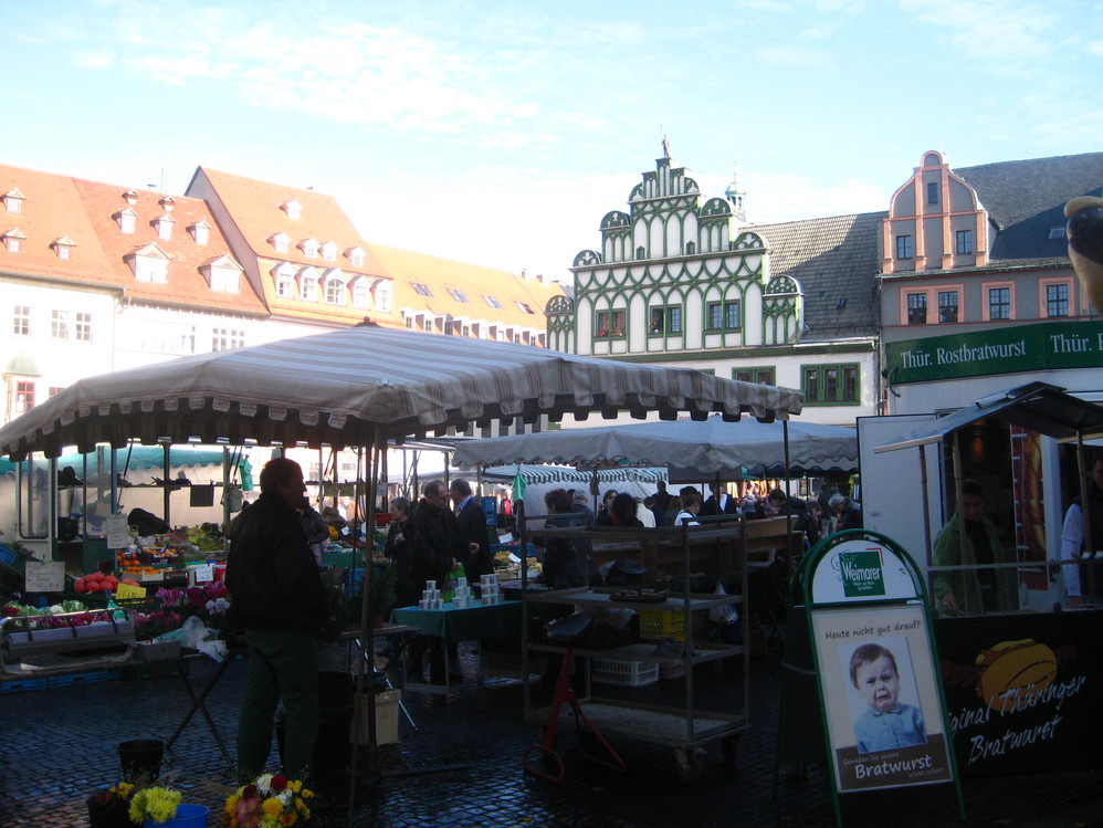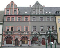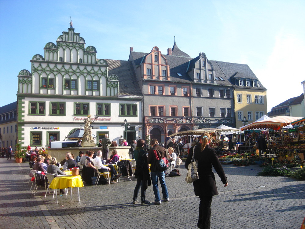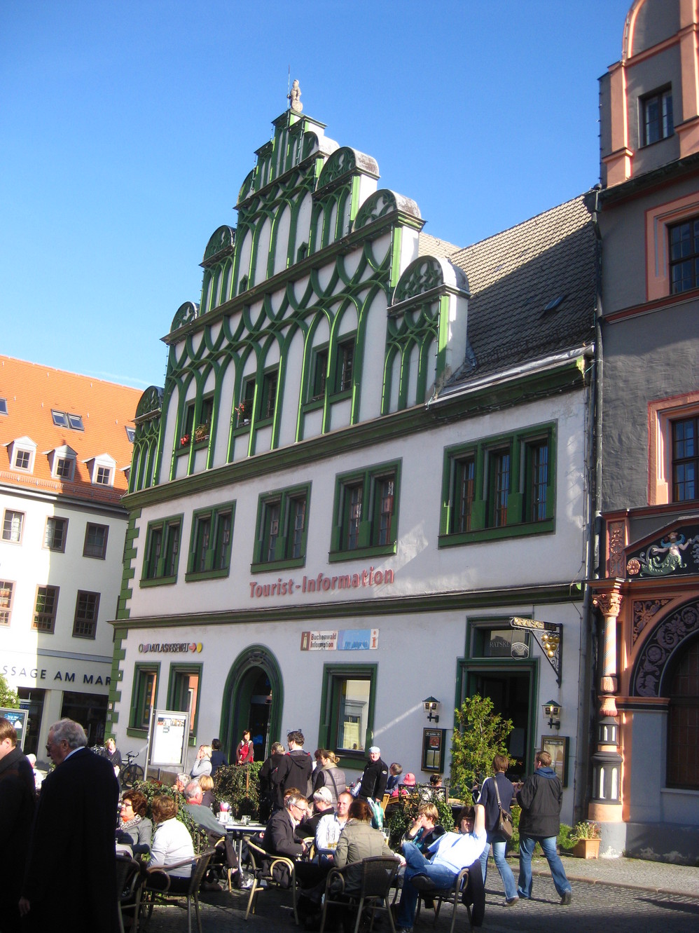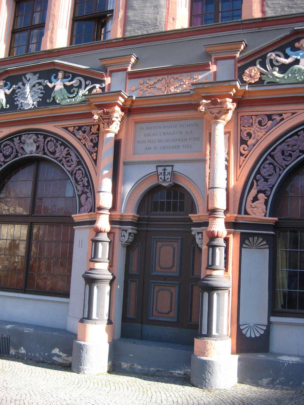集市广场令一侧的卢卡 斯·克拉纳赫故居。画家老卢卡斯·克拉纳赫 在市场广场上,建于文艺复兴早期(1549年)。 卢卡 斯·克拉纳赫在这里有他所谓的“画屋”,并在那里完成了城市教堂的三翼圣坛画像。克拉纳赫在这里度过了他生命中的最后几年。 这座双山墙的建筑有众多的柱子、贝壳 状的隔间和圆拱形的装饰。今天在这里有一个小艺术剧院。