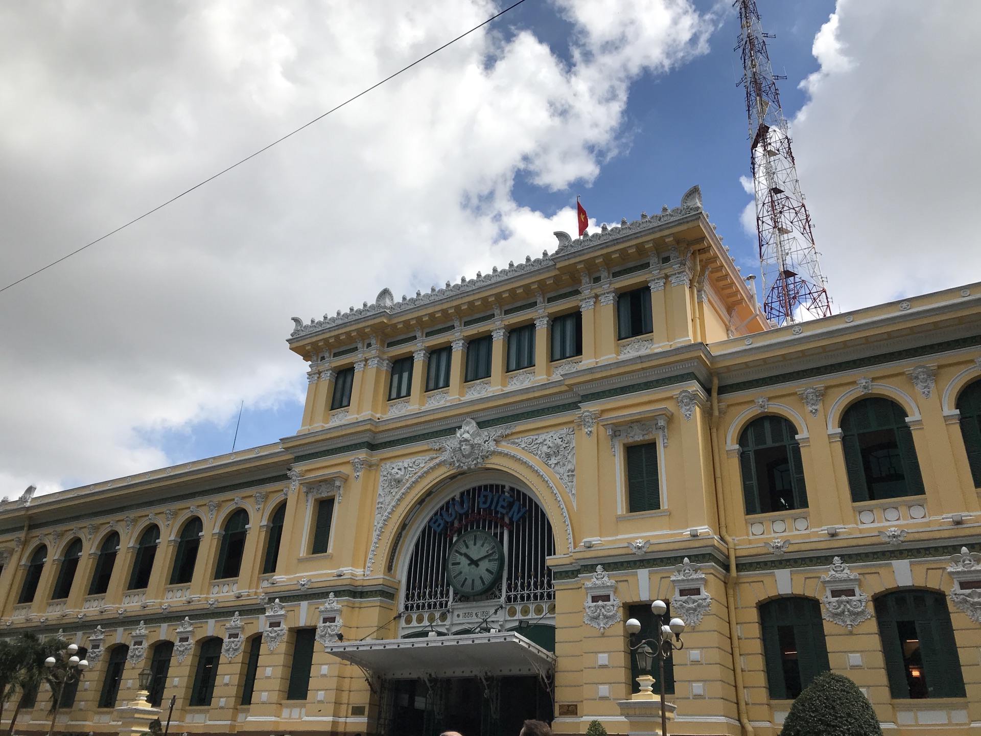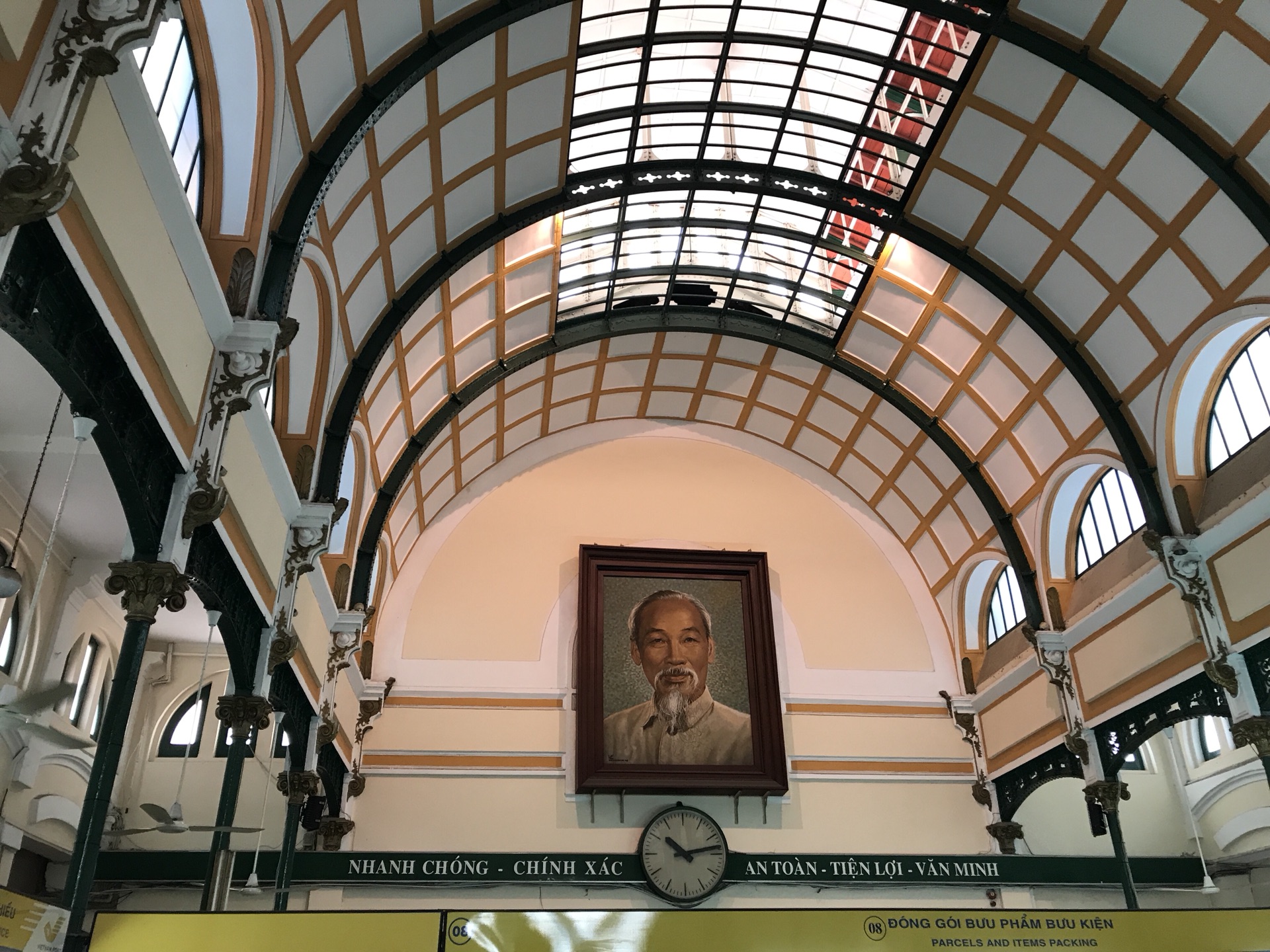 胡志明市中央邮局是由法国著名建筑师古斯塔夫•埃菲尔(Gustave Eiffel)设计建造完成的,大厦整体采用哥特式建筑风格,穹顶极富古典气息,与周围建筑互相呼应,浑然一体。邮局内部装饰华丽,大厅尽头墙壁正中悬挂着胡志明的巨幅画像,神色安详;大厅两侧是业务办理柜台,墙上各有一张大地图,据说是当年法国地理学家手绘的;中部由外到内依次是环形长椅、纪念品柜台和长写字桌等,厅内到处是来来往往的游客,或在这里参观地图,或忙着在胡志明画像前摄影留念,或静静的观望着大厦的圆形花窗和吊灯,感叹这里奇特的建筑和装饰风格。