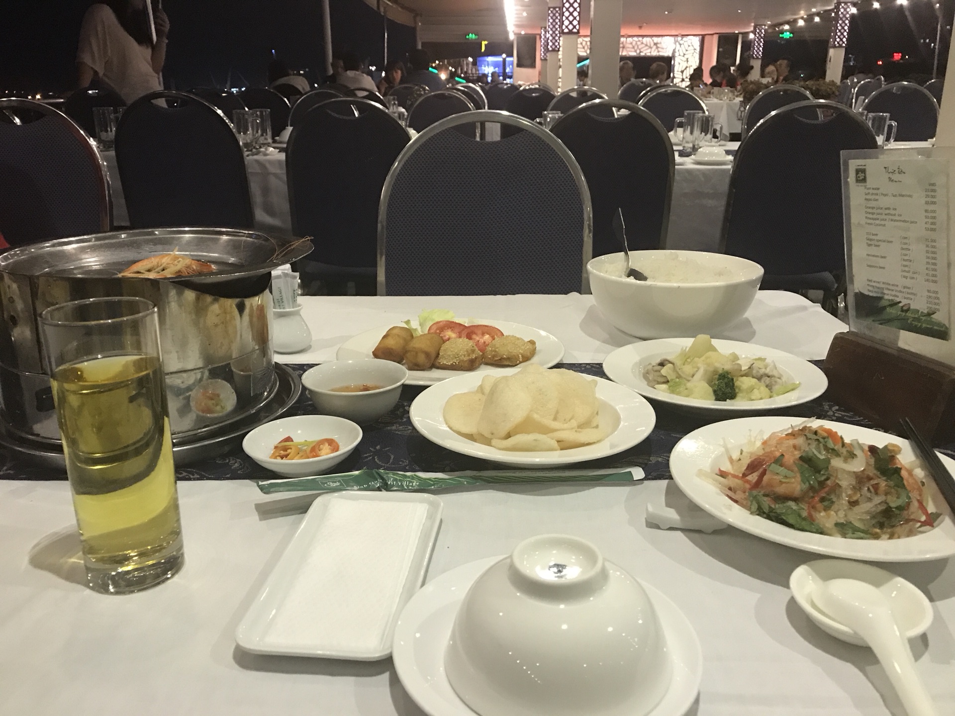 船票包含一顿传统的越南食物。泰式沙拉、煮虾、春卷、空心菜和海鲜面口感都很不错。