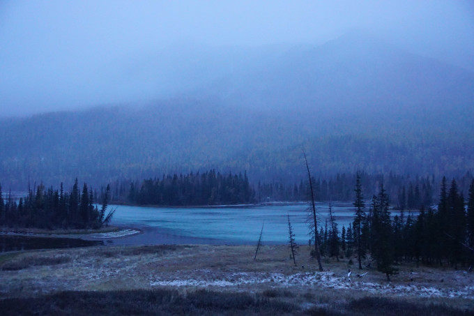 下午听说禾木下大雪可能要封路,于是启程,出景区的路上又欣赏了一遍雪后三湾景色,而且还遇到新疆兵团卫视的采访,我大概说了几句感叹祖国富饶美丽blabla的充满正能量的又红又专的话