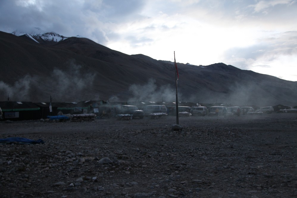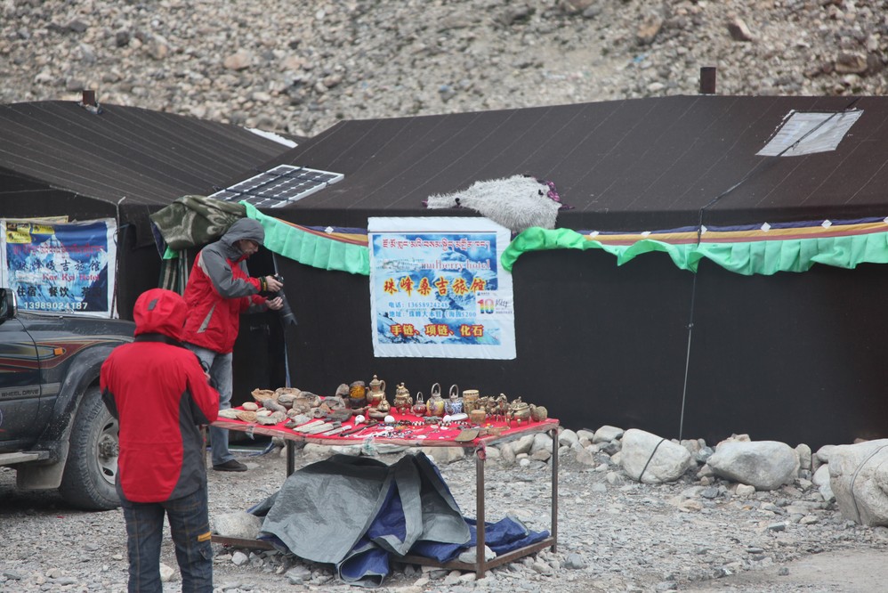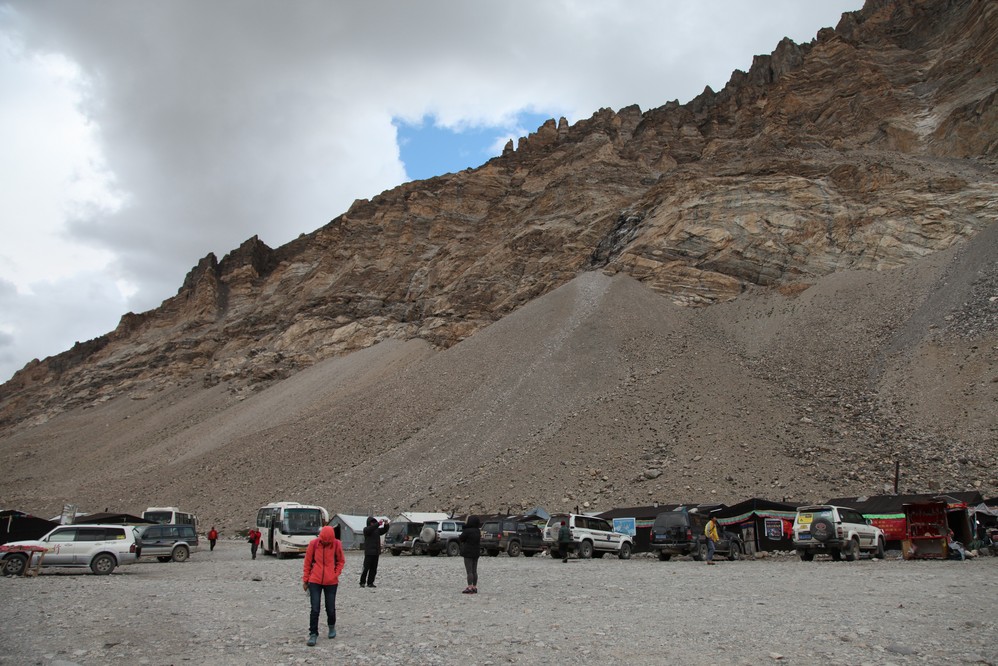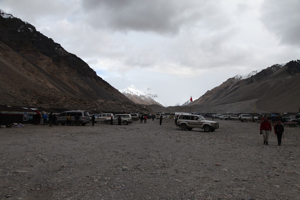 大約下午六點, 我們來到停車場, 需在這裏換環保車才能進入珠峰營地.在停車場前, 路左有一建於1899年的西藏 紅教寺廟, 絨布寺, 海拔5154, 是世界上海 拔最高的寺廟, 但因時間已不太足, 我們只好暫時放棄這個景點.