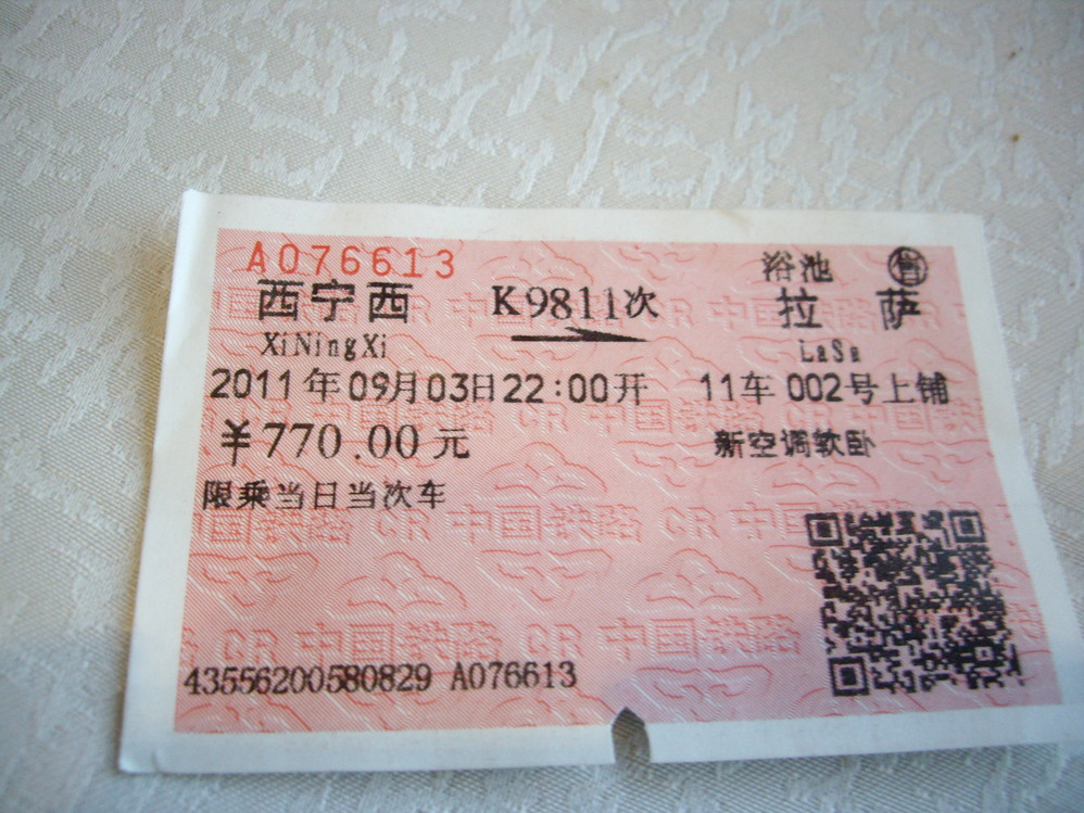 經嚴密的安全檢查後, 於晚上10點鐘, 火車準時自西寧開出,車票上的票價,軟卧是RMB 770元, 但我們却花了RMB 1700元才拿到票, 沒辦法, 想要搭火車上拉薩的人太多了, 軟卧好像只有四個車廂, 128個位置, 所以額外花了近RMB 1000元的"服務費", 聽說, 旺季時的服務費是RMB 2000至20000都有可能, 我們只能用這理由自我安慰囉.