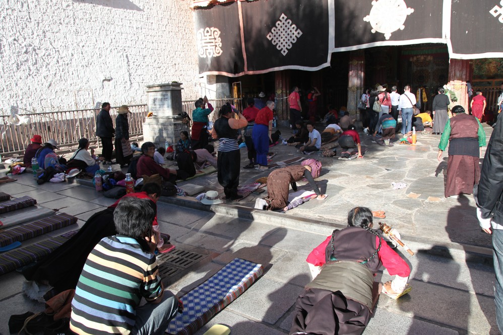 寺外, 虔誠的藏人在寺外作五体投地的禮佛, 聽說, 上午來朝拜的人更多, 但下午為方便遊客旅遊, 故意把它作成區隔, 所以我們在下午來.