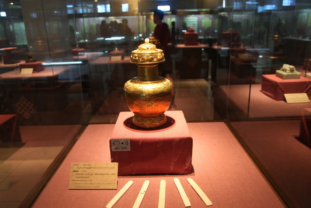西藏 博物館占地面積53959平方米,總建築面積23508平方米,展廳面積10451平方米,宏偉壯麗。這是位於館內的金瓶合簽, 乃1793年清乾隆所頒, 用以確認達賴, 班禪等大活佛的轉世靈童.