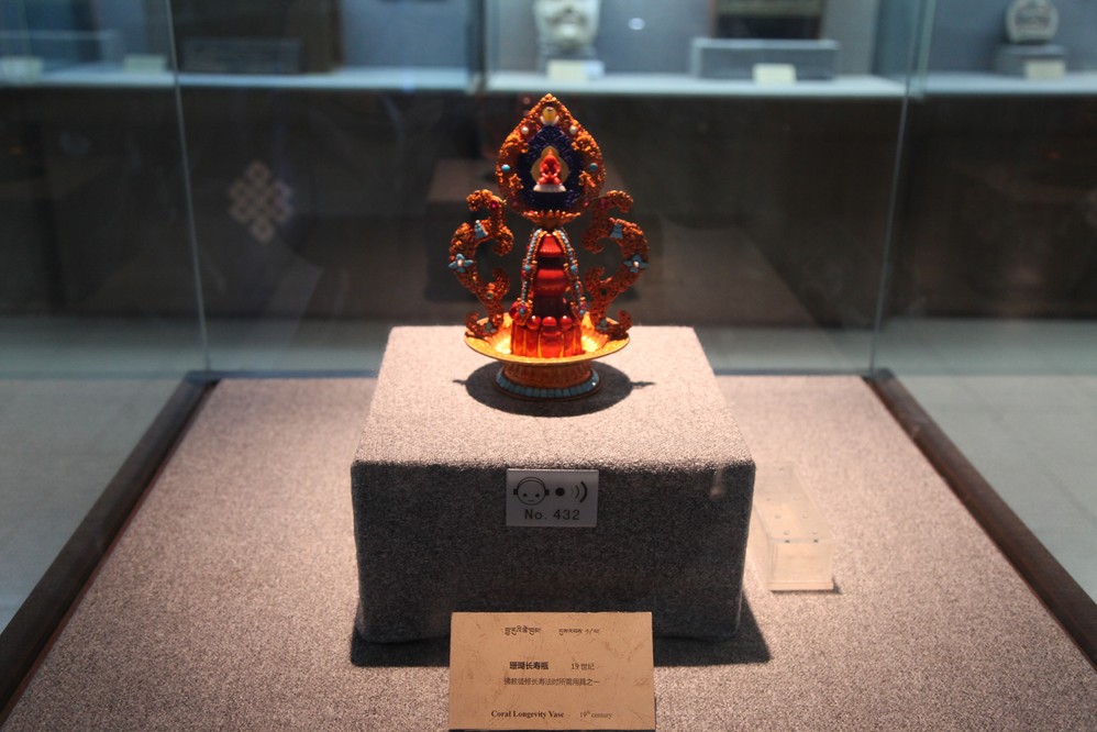這是珊瑚長壽瓶, 是佛教徒條長壽法所需的工具, 但位處高山的西藏 怎有珊瑚呢??原西藏 位於海底, 經歐亞板塊與大陸板塊碰撞後隆起, 故這裏的珊瑚稱為山珊瑚,