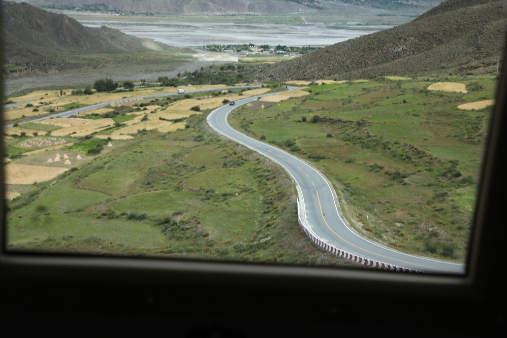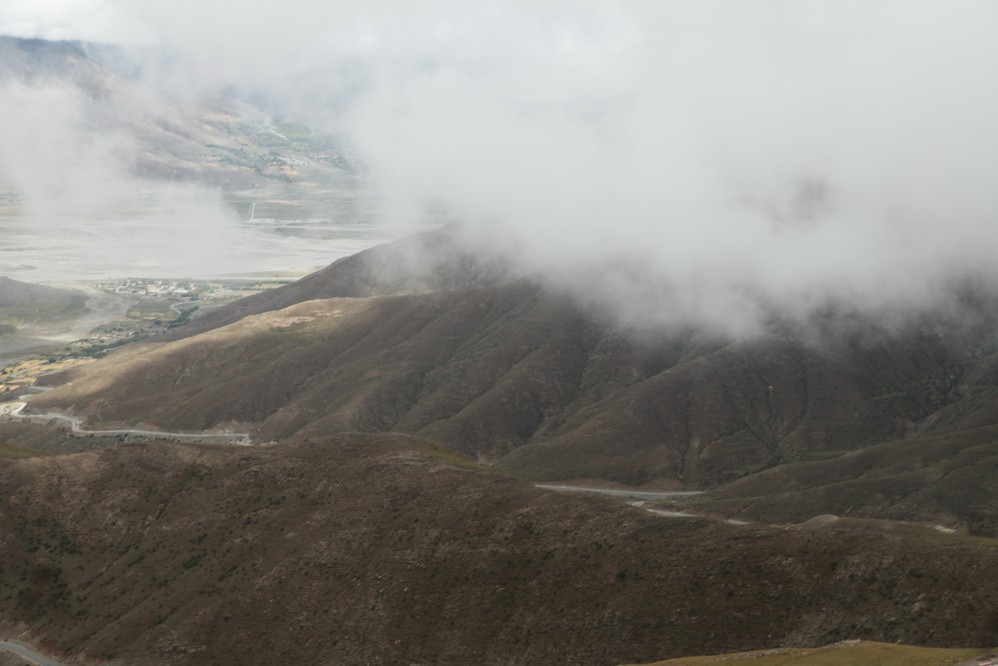 之後, 車往南走, 沿著山路往上走, 一回頭, 眺望遠處的拉薩河, 及我們沿路經過的小米梯田, 煞是好看.