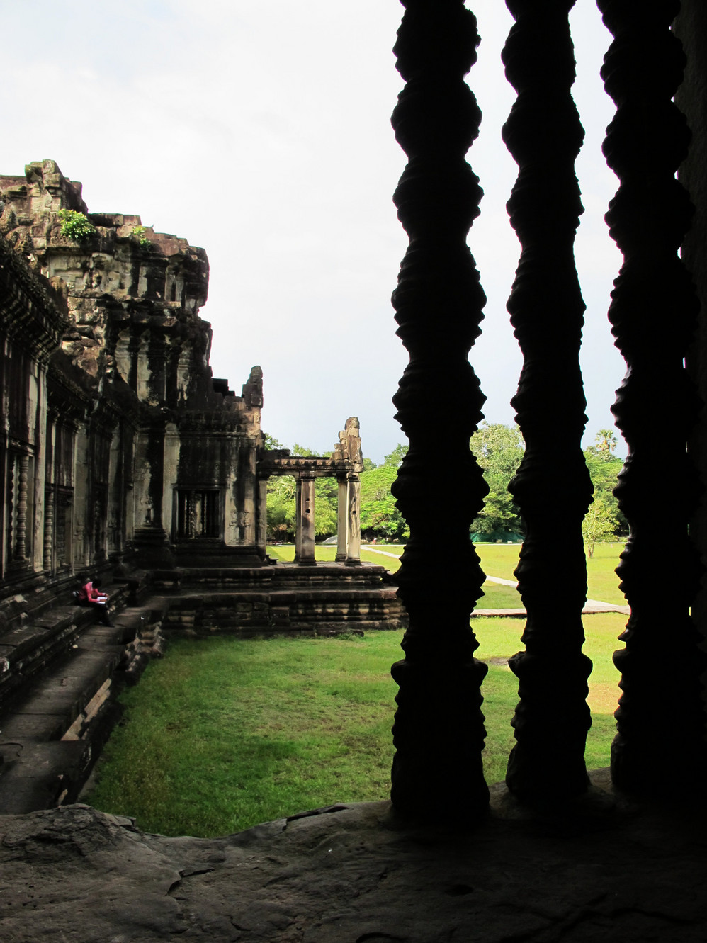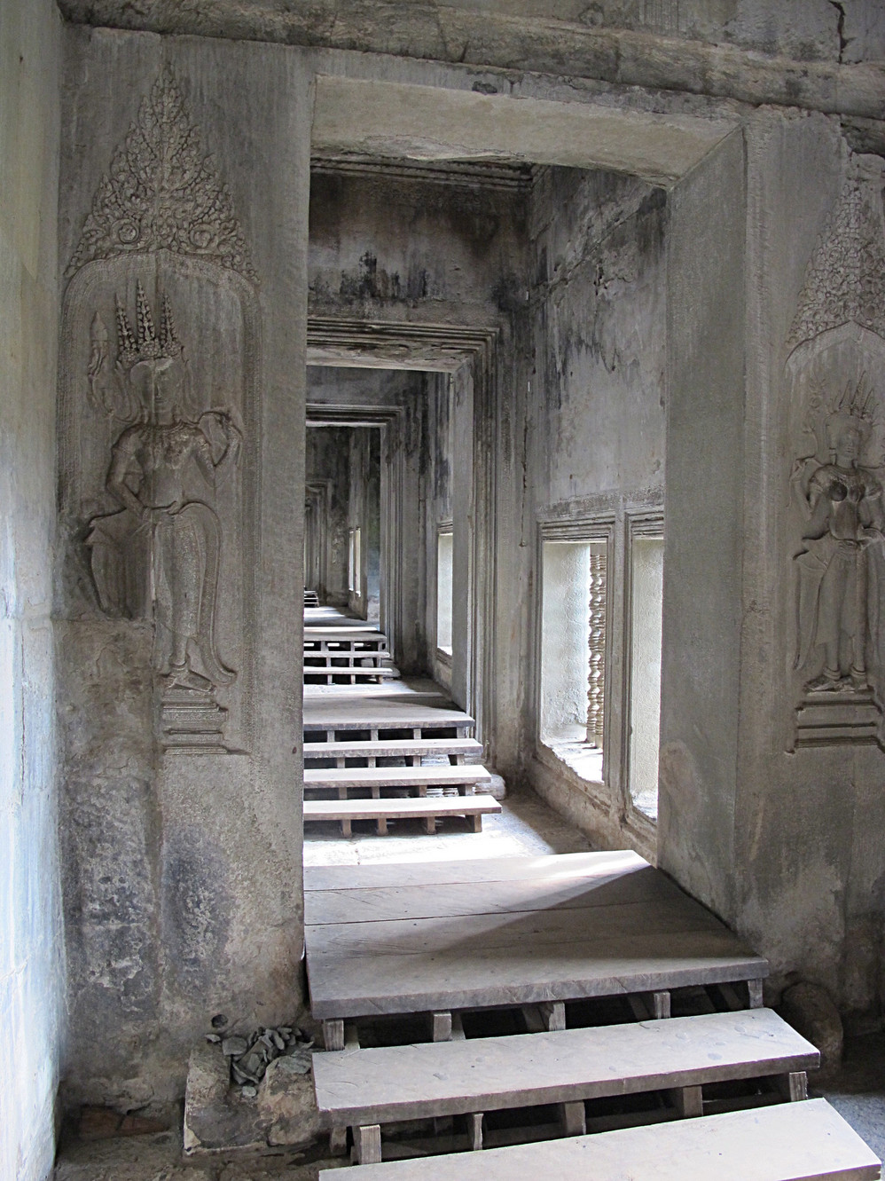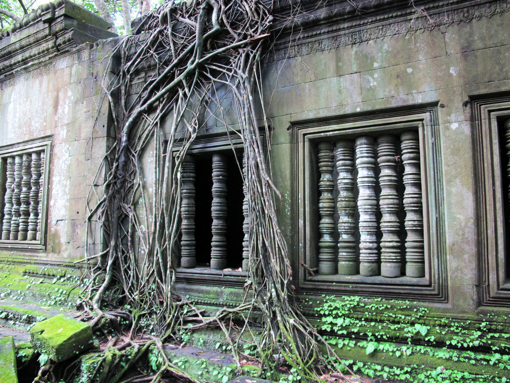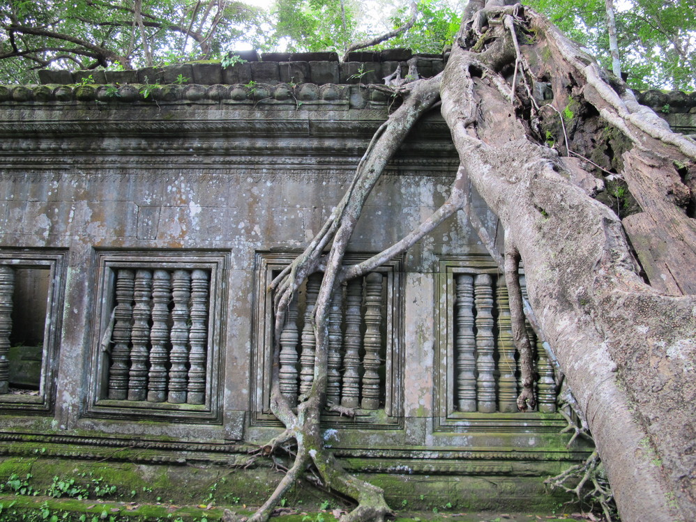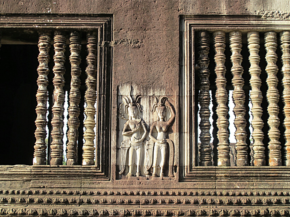在这里我才真正体会了吴哥窟 艺术的恢弘、精美。它的建筑不同我们早前看到在崩密列、比粒寺寺看到的那样粗放,材质带有铁质感,细腻、坚硬,因而在这上面的浮雕石刻线条精致,人物五官清秀端庄。长长的回廊方正 的窗框装饰象珠子的窗柱,太阳的余光透过来就像中国 的剪纸,在这里你的心是圣洁、肃穆的,不管你是否信奉他们的教义,你都不由对这里的一切怀有敬仰之情!