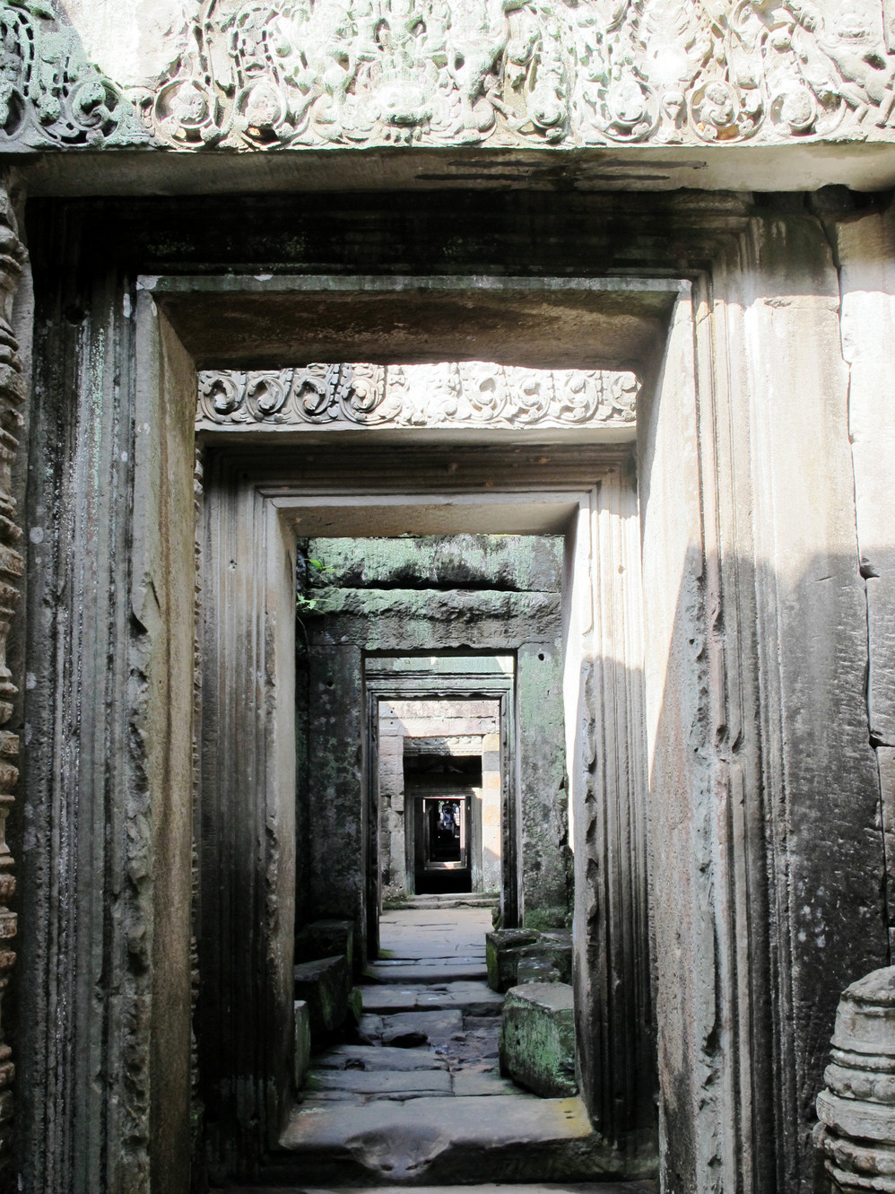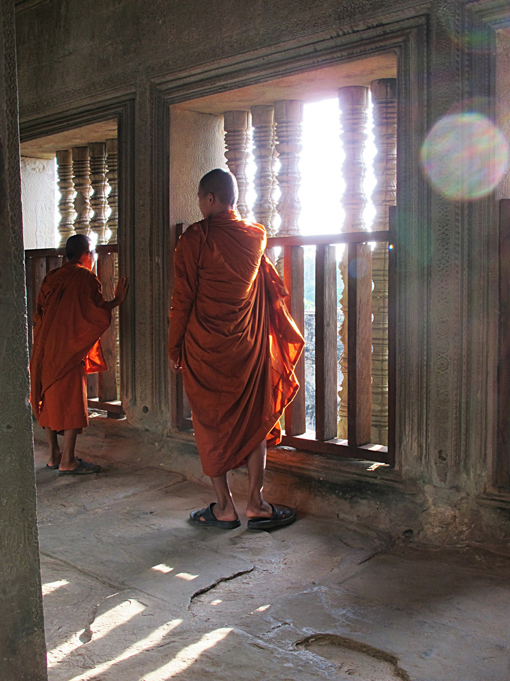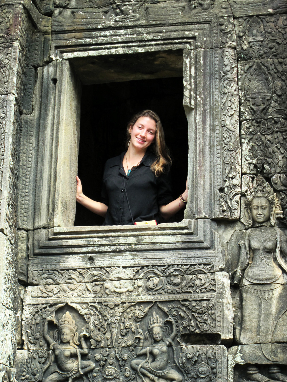 在这里我才真正体会了吴哥窟 艺术的恢弘、精美。它的建筑不同我们早前看到在崩密列、比粒寺寺看到的那样粗放,材质带有铁质感,细腻、坚硬,因而在这上面的浮雕石刻线条精致,人物五官清秀端庄。长长的回廊方正 的窗框装饰象珠子的窗柱,太阳的余光透过来就像中国 的剪纸,在这里你的心是圣洁、肃穆的,不管你是否信奉他们的教义,你都不由对这里的一切怀有敬仰之情!