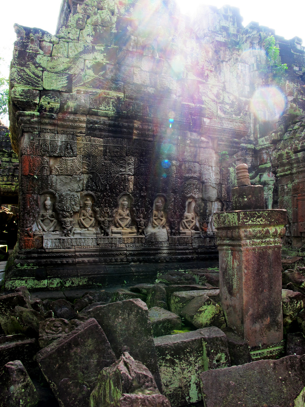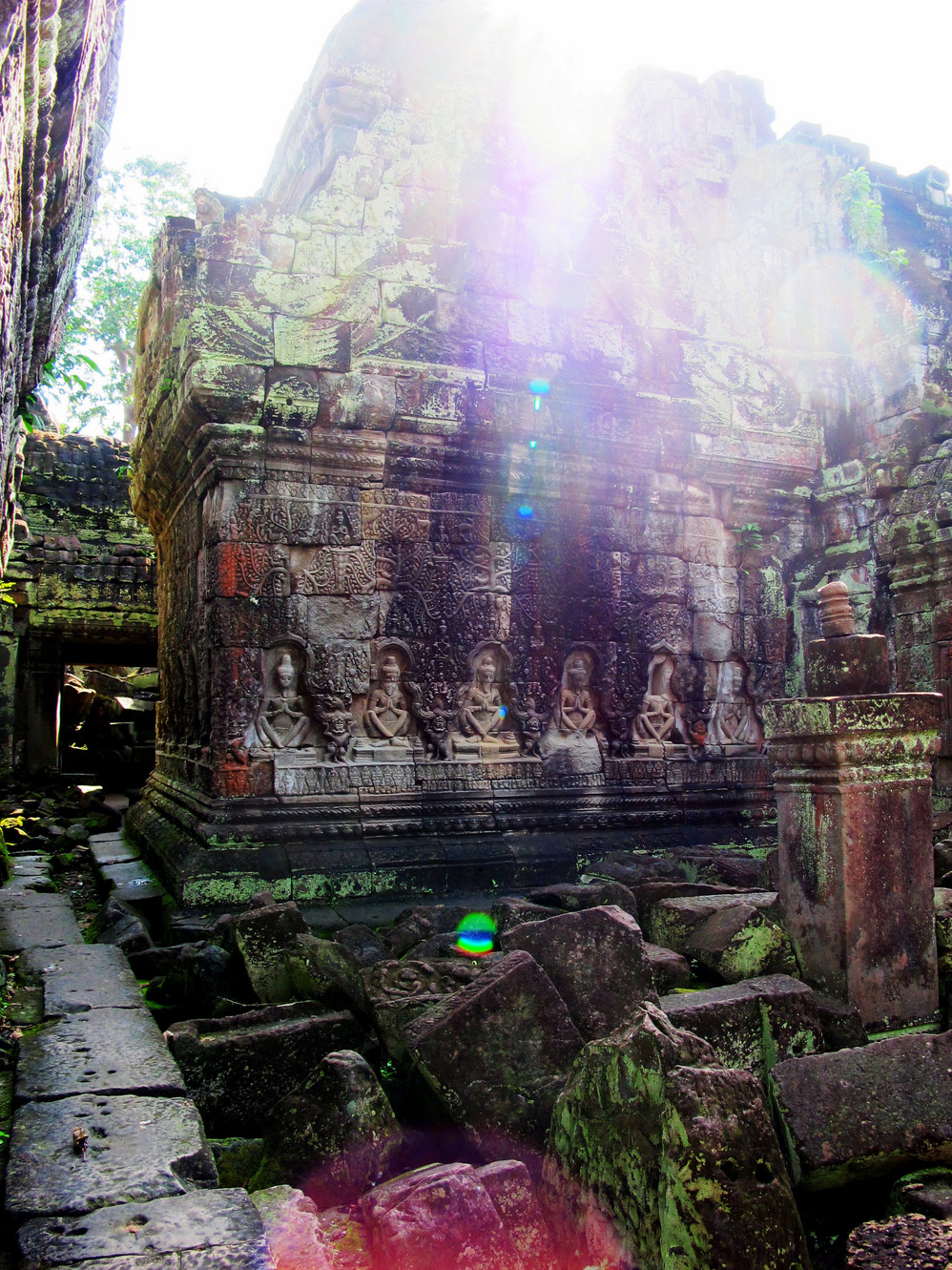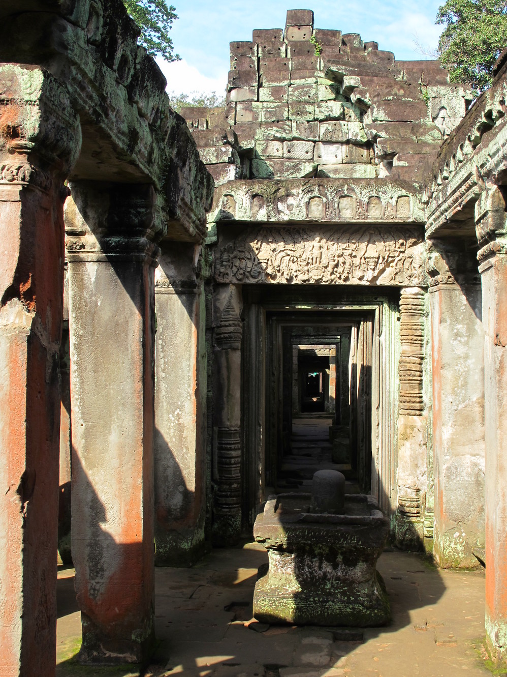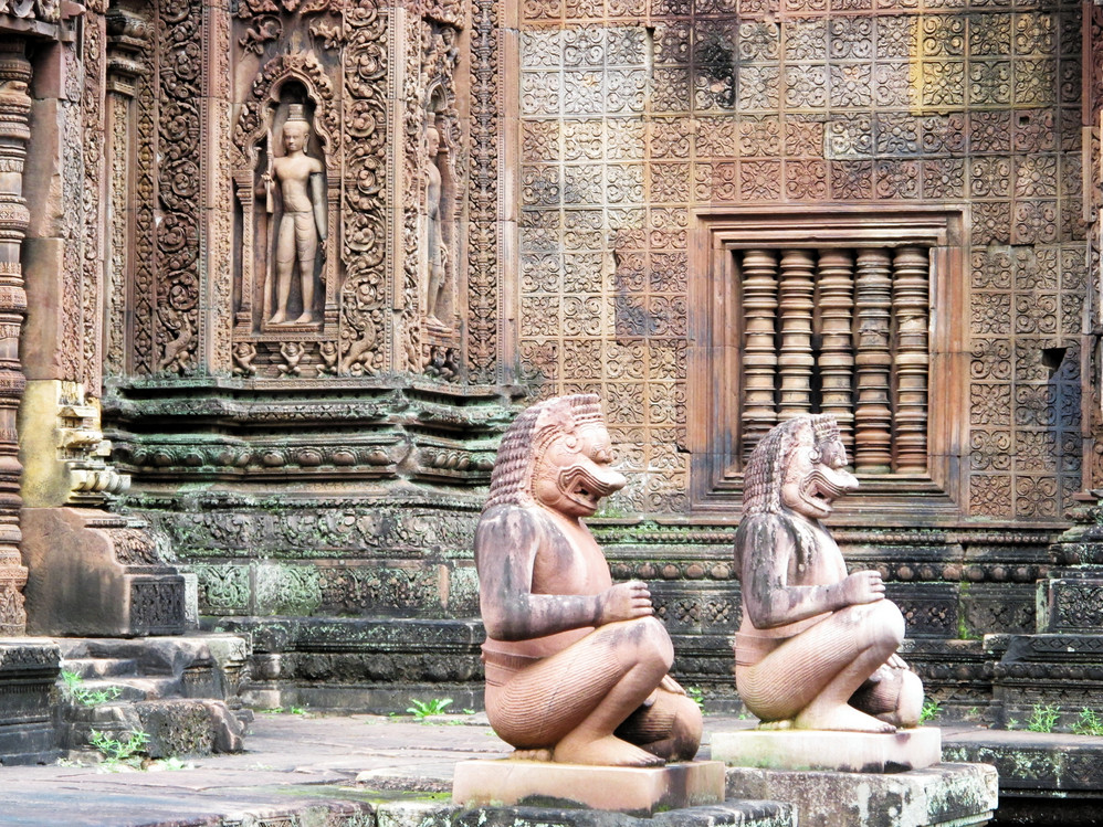 在这里我才真正体会了吴哥窟 艺术的恢弘、精美。它的建筑不同我们早前看到在崩密列、比粒寺寺看到的那样粗放,材质带有铁质感,细腻、坚硬,因而在这上面的浮雕石刻线条精致,人物五官清秀端庄。长长的回廊方正 的窗框装饰象珠子的窗柱,太阳的余光透过来就像中国 的剪纸,在这里你的心是圣洁、肃穆的,不管你是否信奉他们的教义,你都不由对这里的一切怀有敬仰之情!