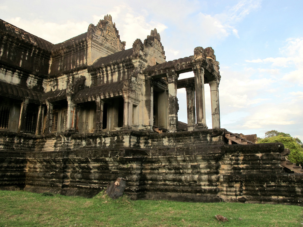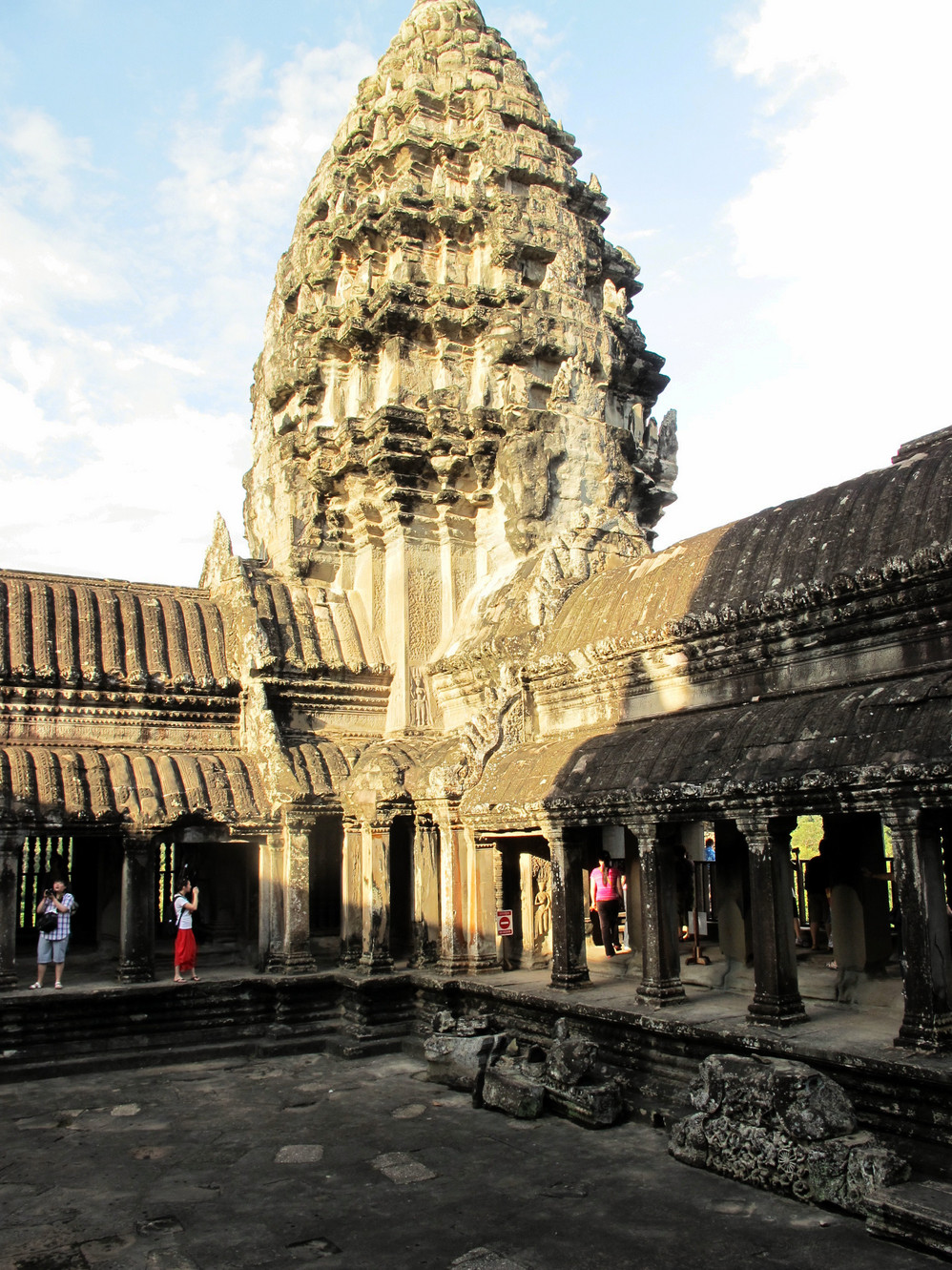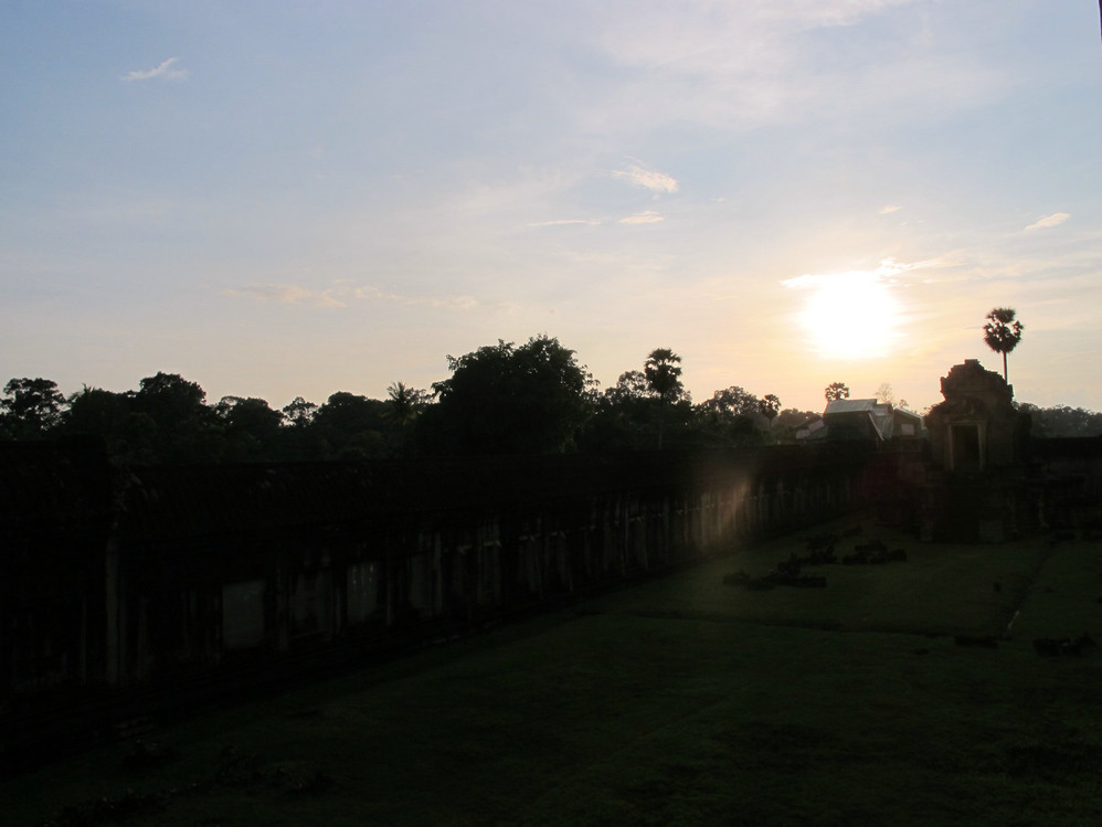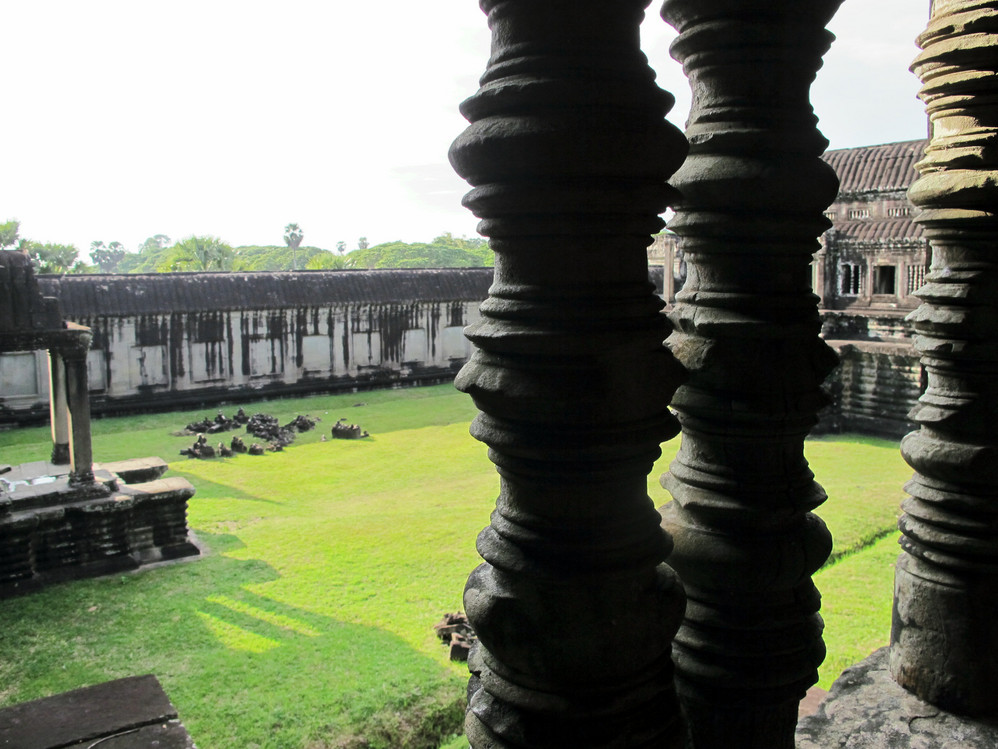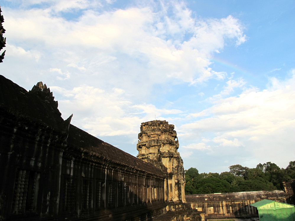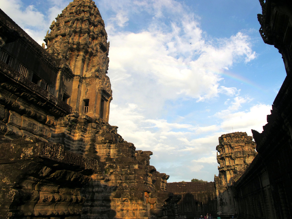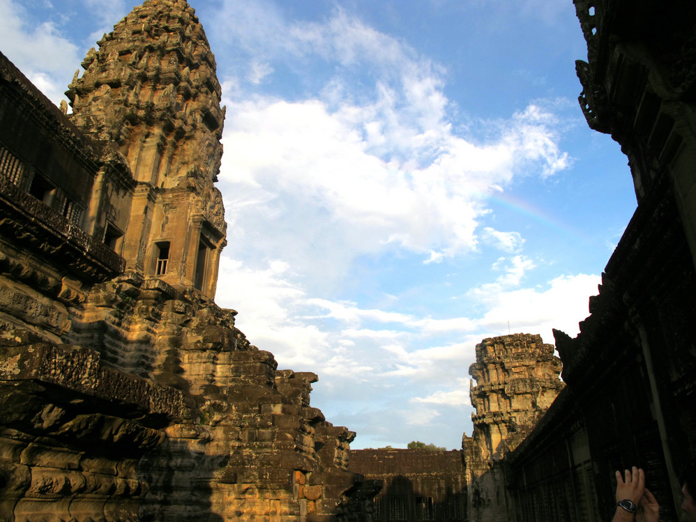 在这里我又开始“旧疾”发作,手中的相机不停地猛拍,在回廊的窗框往外拍,在回廊的一头往那头拍,不觉走到了第三层的中庭,一抬头,呆住了!下午三时的太阳斜照在小吴哥的外墙上,灰黑的外墙就像给什么人涂上了一层金粉,整座建筑在太阳的照耀下熠熠生辉。小吴哥就像一个经化装大师精心打扮的美艳女神,展现出她别样的金碧辉煌。难怪到过这里的人都会称其为“摄影者的天堂”。我口中不停地在念叨道:呵!神奇神奇!好想好想在这里静静一个人坐下,任思绪慢慢流淌…..