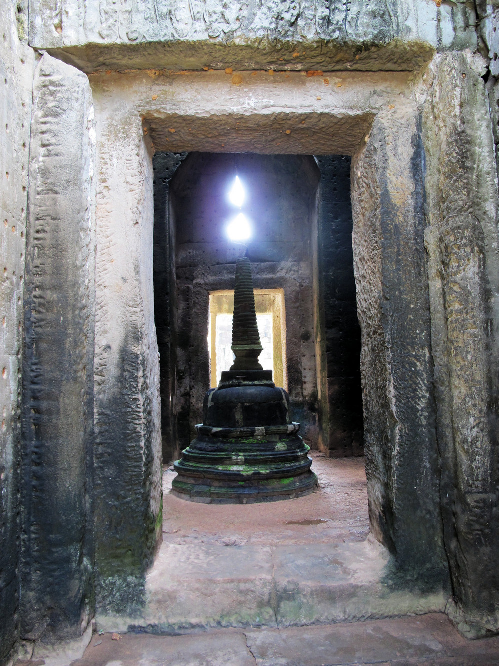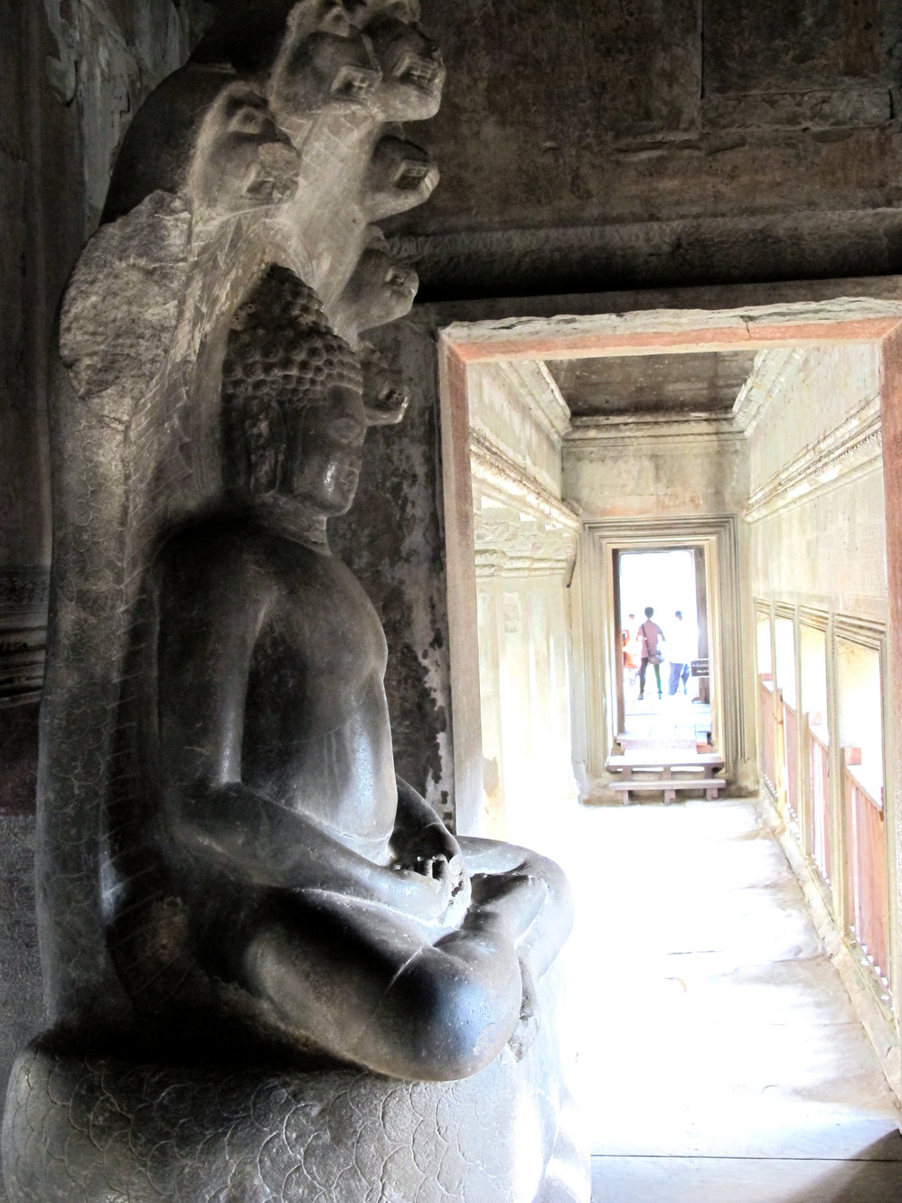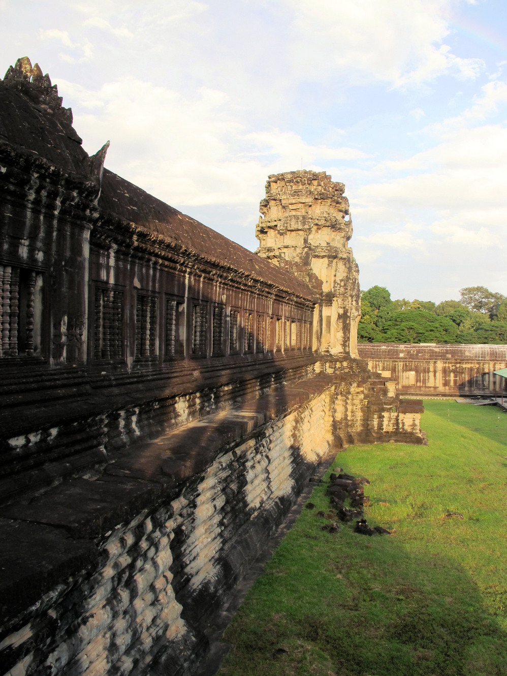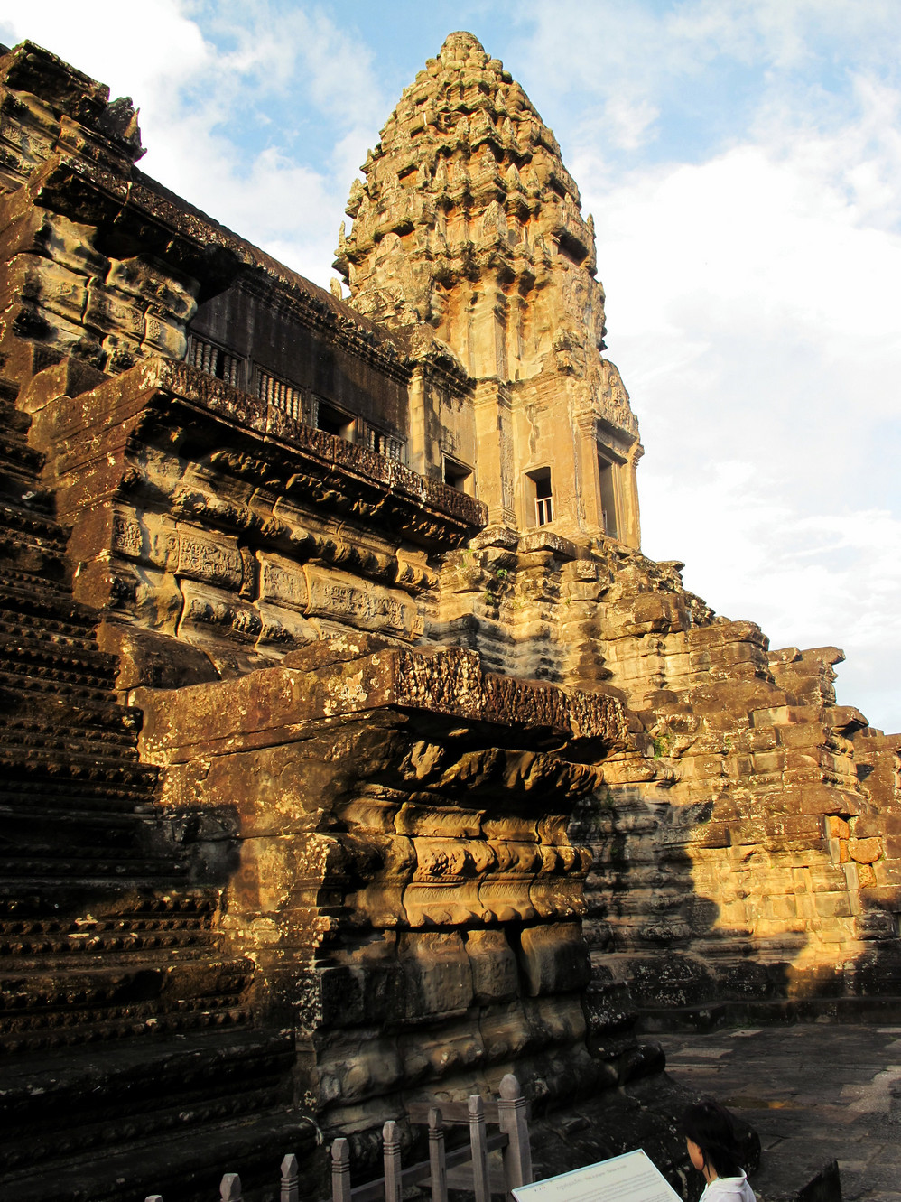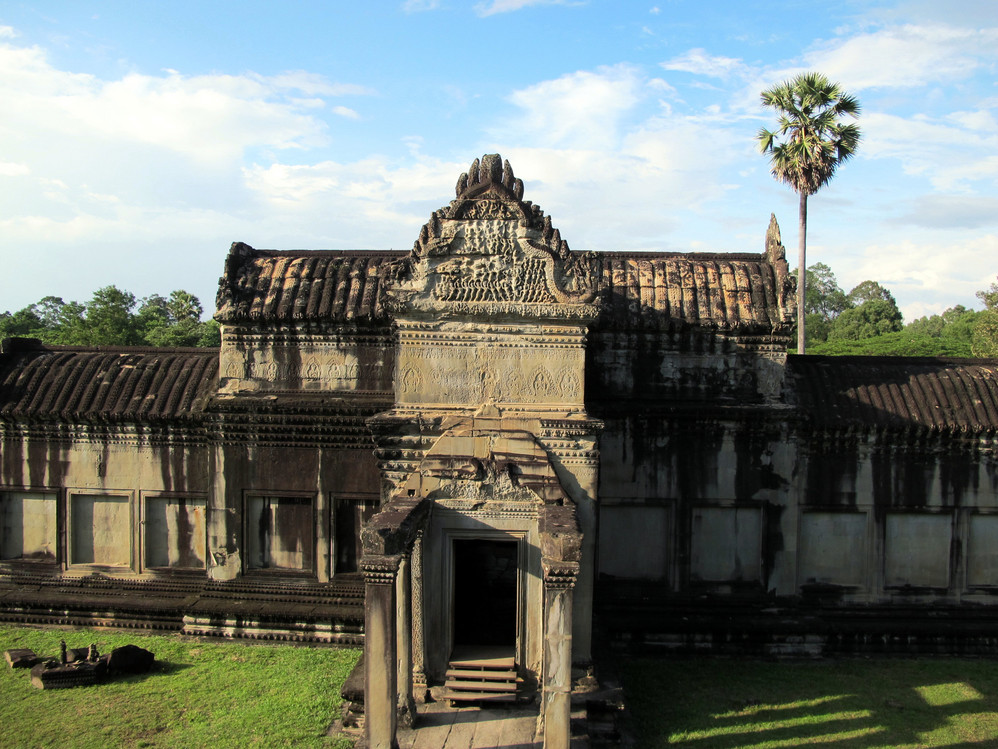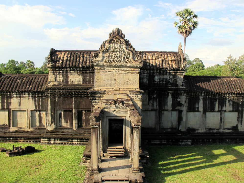 在这里我又开始“旧疾”发作,手中的相机不停地猛拍,在回廊的窗框往外拍,在回廊的一头往那头拍,不觉走到了第三层的中庭,一抬头,呆住了!下午三时的太阳斜照在小吴哥的外墙上,灰黑的外墙就像给什么人涂上了一层金粉,整座建筑在太阳的照耀下熠熠生辉。小吴哥就像一个经化装大师精心打扮的美艳女神,展现出她别样的金碧辉煌。难怪到过这里的人都会称其为“摄影者的天堂”。我口中不停地在念叨道:呵!神奇神奇!好想好想在这里静静一个人坐下,任思绪慢慢流淌…..