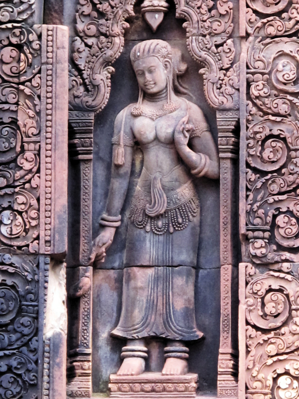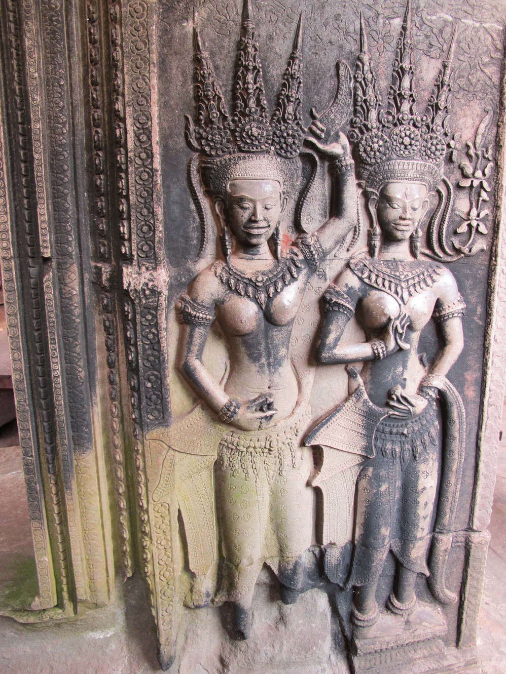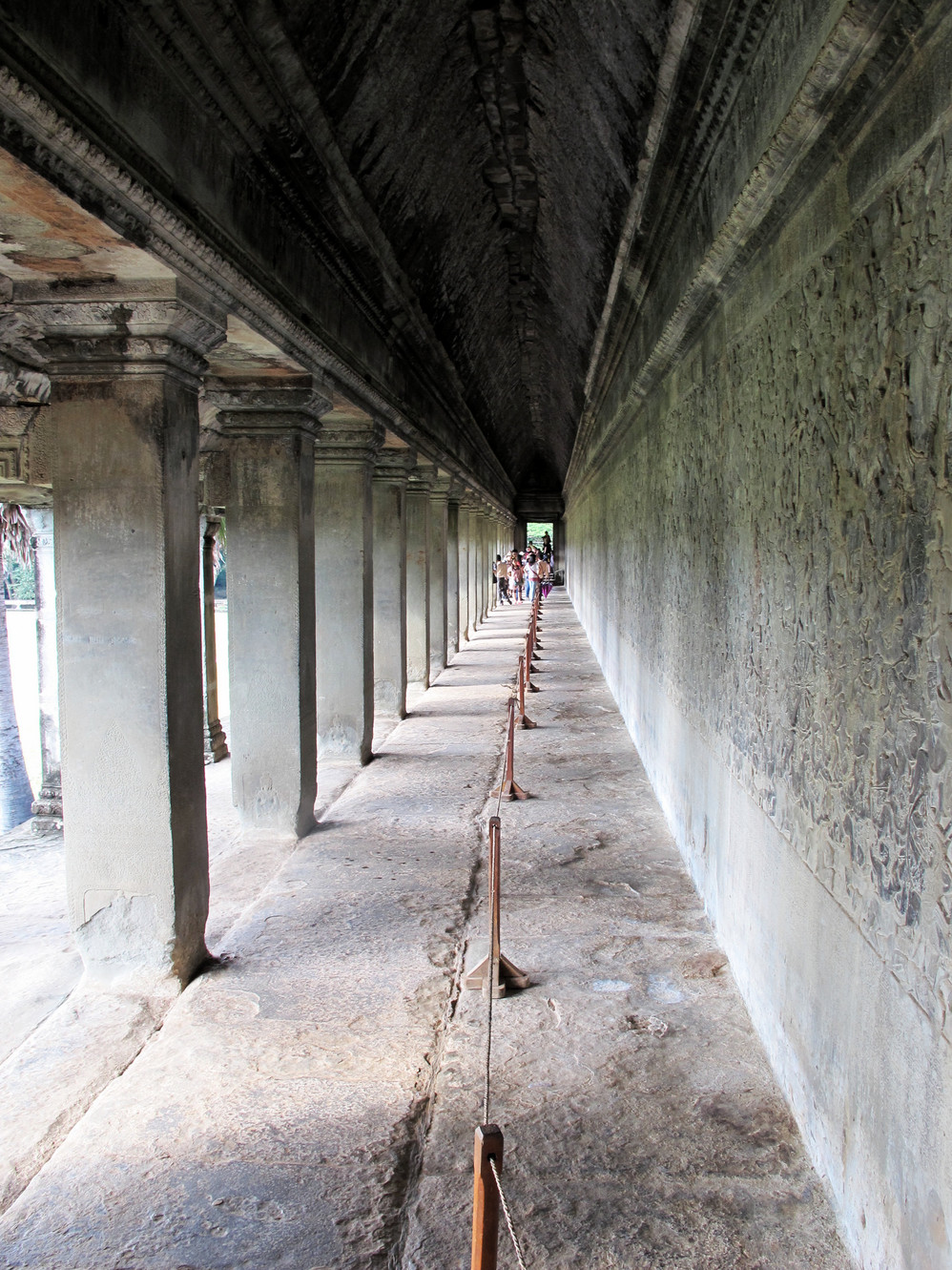游人通过栈桥进入小吴哥,迎面是五座像玉米穗的尖塔,三道石砌回廊围绕着它们,全部回廊、殿柱、门楼、宝塔都有精美的石刻浮雕,而以最低一层的浮雕回廊为最精美。四边的回廊总长度800米,高2米多。壁面布满浮雕画面,题材大都取自印度 史诗《罗摩衍那》和《摩诃婆罗多》中的神话故事。东廊刻的是“乳海翻腾”的传说,北廊是毗湿奴同妖魔作战的故事,西廊是这个故事的继续 “神猴助战”图,南廊反映高棉人抵抗占人入侵战争情景。这一幅幅的浮雕画寓意深刻,形象逼真,人物姿态生动。