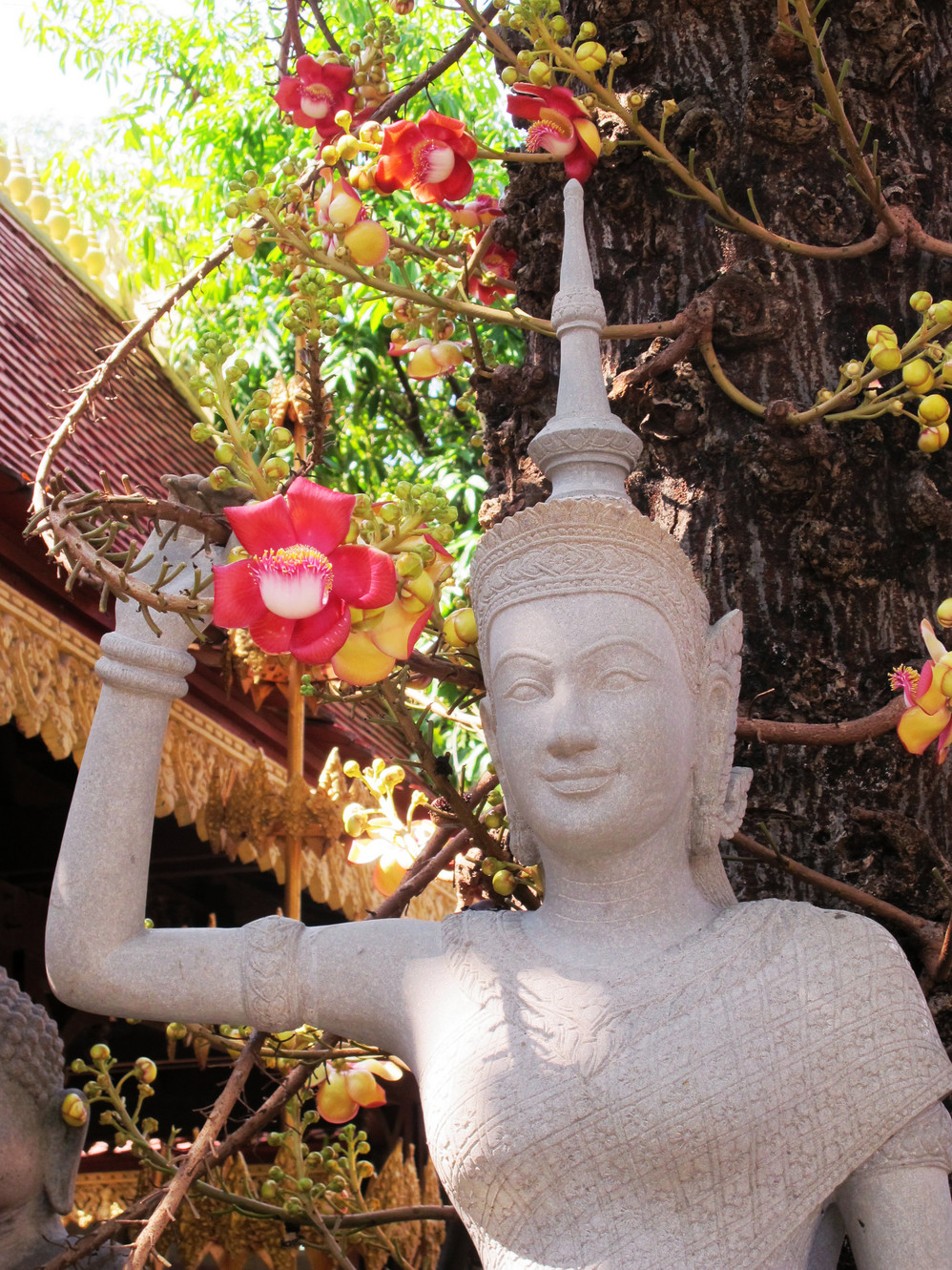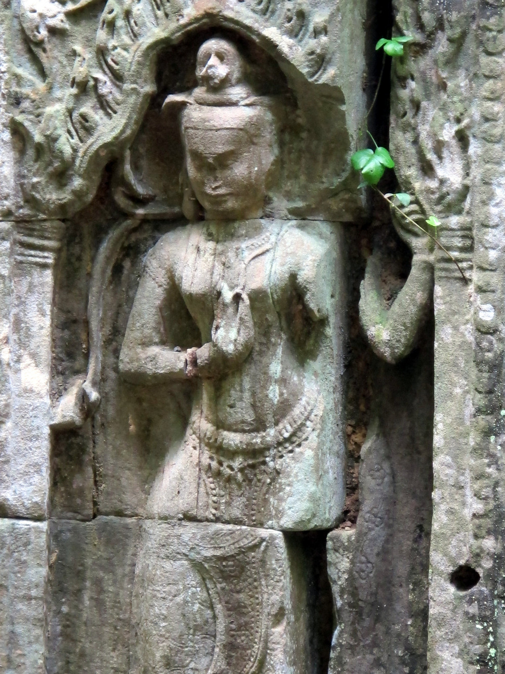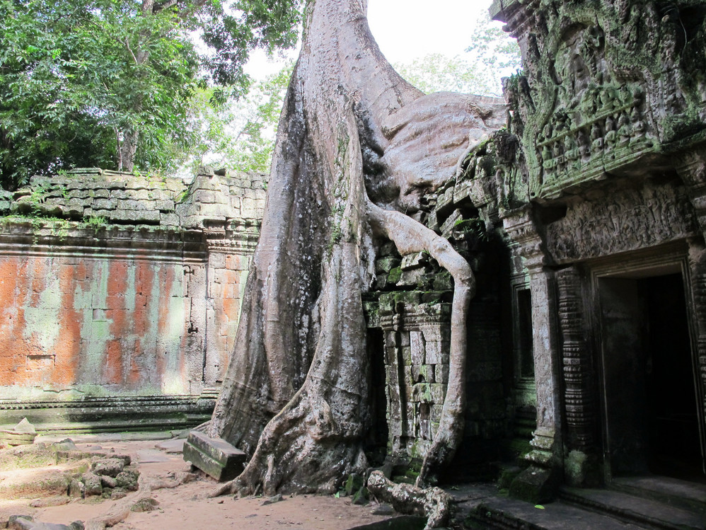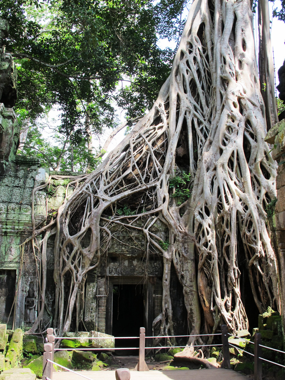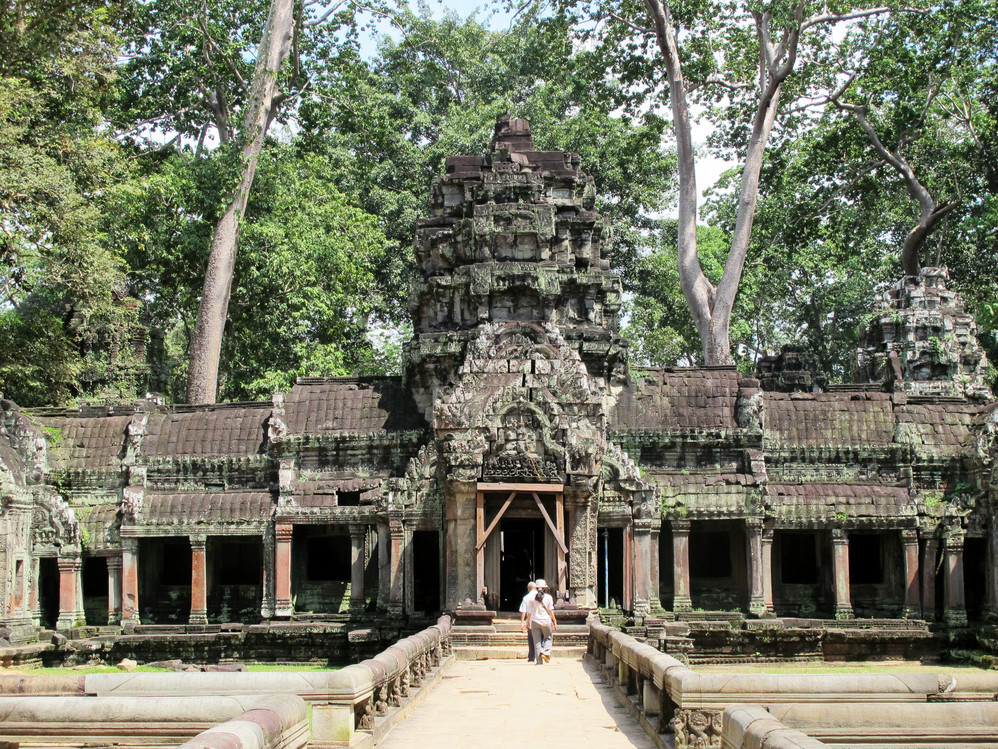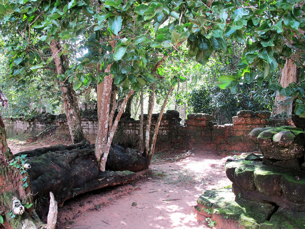 第四天,我们只有半天时间在暹粒 ,司机说没问题,我安排好,你们放心好了,一天的接触我们已对这位纯朴的大叔好放心了,东梅奔——塔逊——豆冠寺——圣剑寺等景点一路走马观花地看,其中塔逊的生态环境特别典型:树根向四面八方匍匐伸展,长达十多米。粗大的树根盘旋而上,死死地缠住了古寺庙,吞噬了整个寺庙入口和拱门。这些又粗又圆的树根竟然缠绕在石塔上,骑跨着围墙,撑破穿透了建筑。难怪有人戏称,这是一种让人窒息的“拥抱”。其实,只不过是塔逊表现得特别典型,在吴哥窟 除了重新修葺的地方,看到的都是散落在地下长满青苔的石块,恣意生长的树木与建筑和睦共生,你中有我,我中有你。这番景像,常使人恍如在在时光隧道中穿越,生出无限想像:当年这里是怎一番的繁华?吴哥王朝的公主少爷们应曾在这里嘻戏玩耍吧?