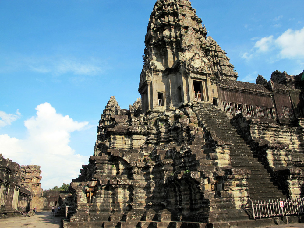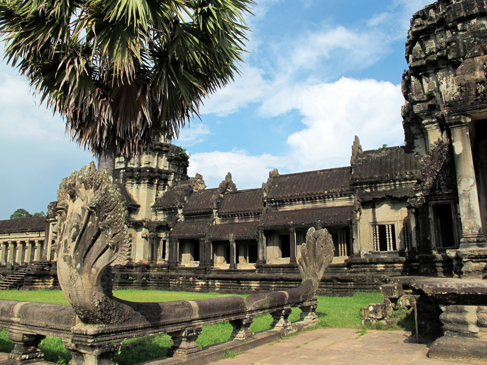 小吴哥由宽宽的护城河包围,庙宇的外面有一条近10米宽的堤路,直通庙宇的大门,堤路的两边竖立着巨大威严的那伽蛇神像 。—般来说,世界各国所有的庙宇 都是坐西朝东,而唯独吴哥庙大门朝西,这使后来研究古代高棉的考古学家百思不解。吴哥窟 对我们来说有太多的不解,但也可能正是由于它神秘不测才更彰显它的迷人之处。