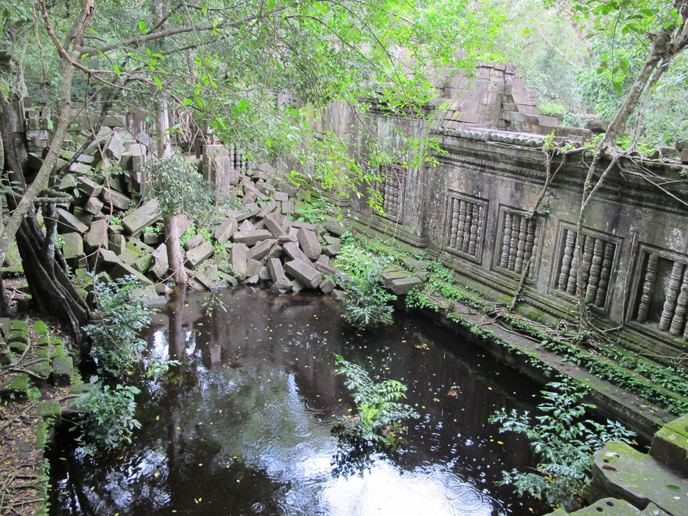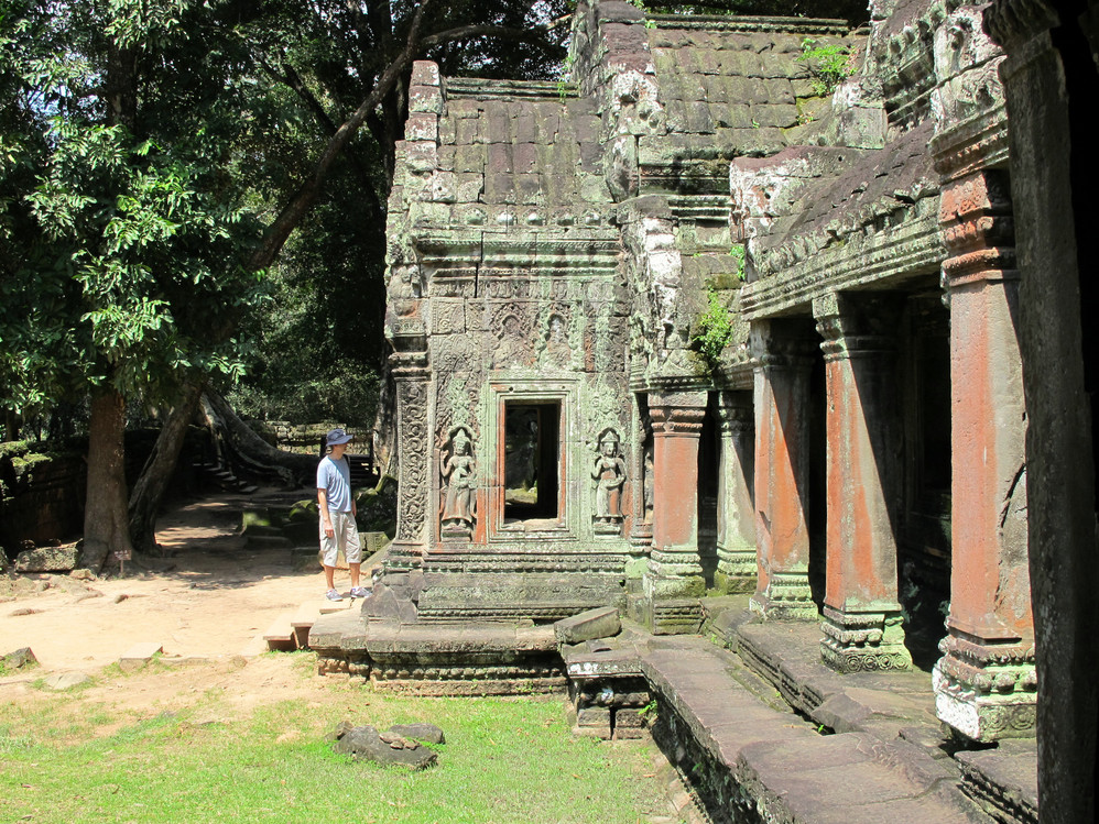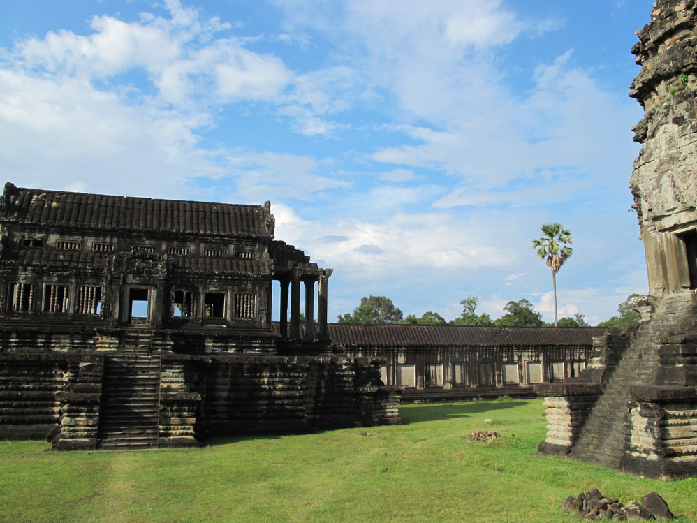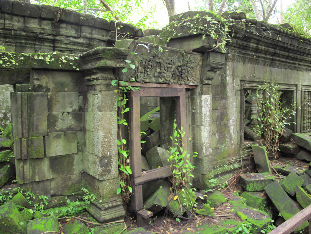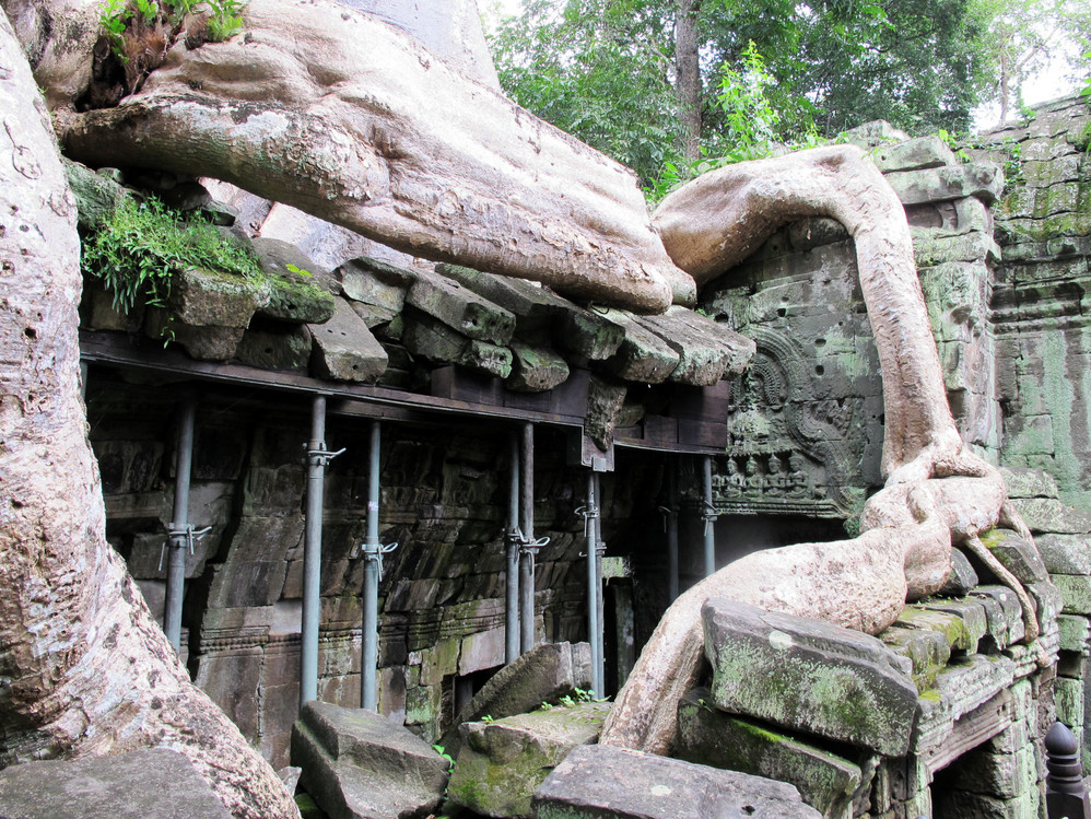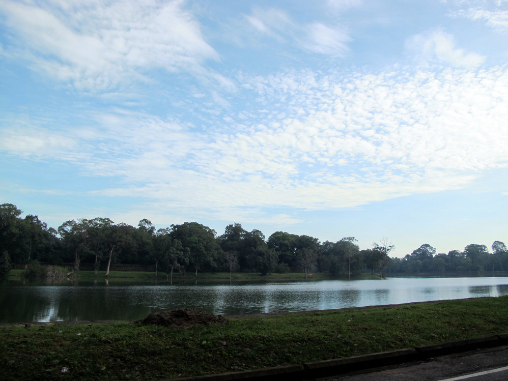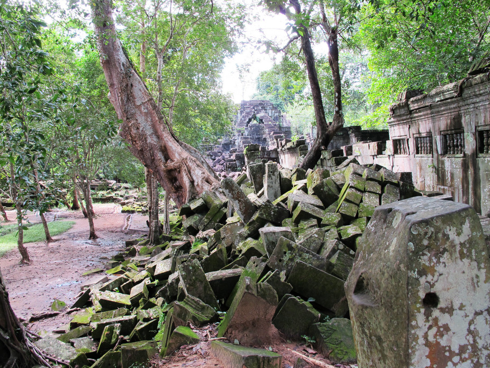 第一天给我最大的冲击是人文景观,自然景像倒没太多特别,是想像中的东南亚 景色,我们大家一直在追问的是吴哥窟 的历史,它为什么会建在那里?为什么后来又衰落了?里面的人都去了哪里?看起来它的建筑材料不坚固(就像我们这里的高岭土)但却硬生生的就是这样堆砌起来,一次次地倒塌还是要这样做,在崩密列看到的景像更使我们觉得好多地方可能当初就是在一次次倒塌失败后放弃不建的,而不是后来给岁月摧毁的。但是我们手头所有的资料都没给出一个答案。