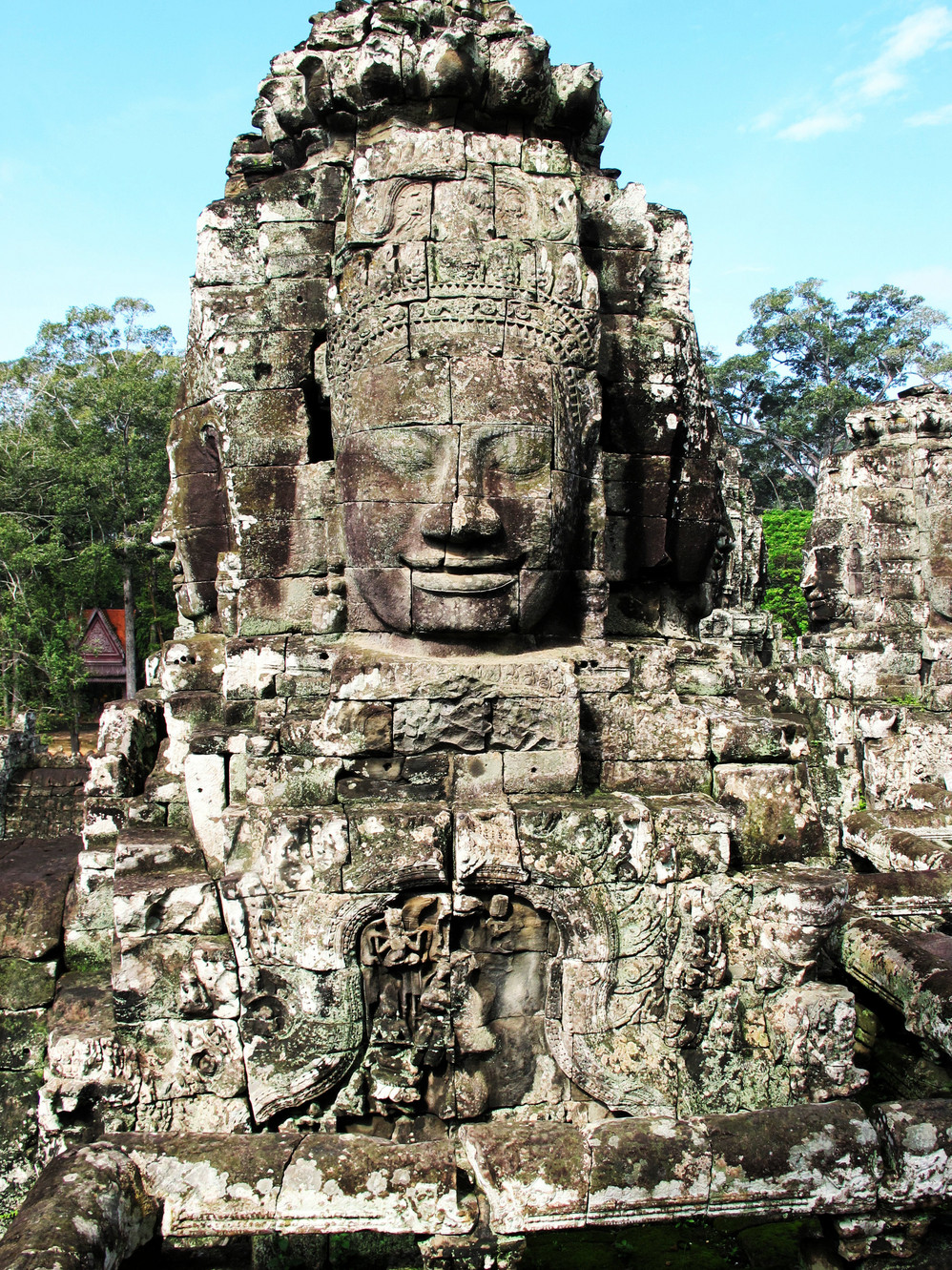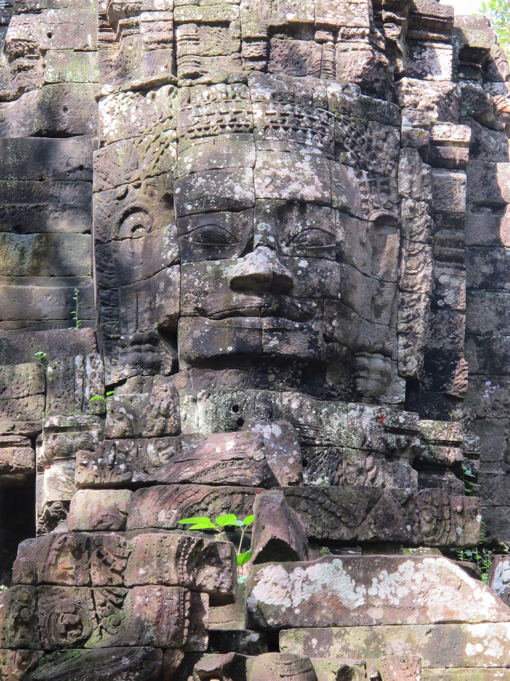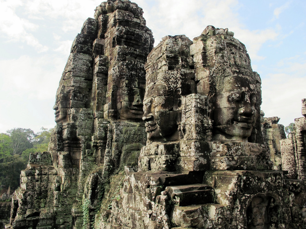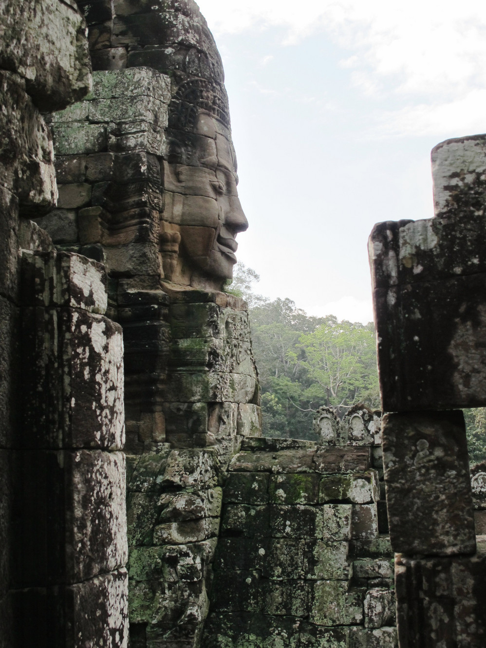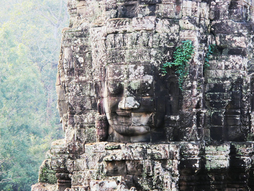 在巴戎寺我们身处吴哥国王的微笑包围中。这里有216张四面佛的巨脸俯视着你。如果你不了解那里的文化,你就不能体会这些巨脸笑容的内涵。据说最经典的微笑就在这里,我还冒充了某旅游团友,叫导游帮忙照了一张同国王阗耶摩七世隔空亲吻的照片。