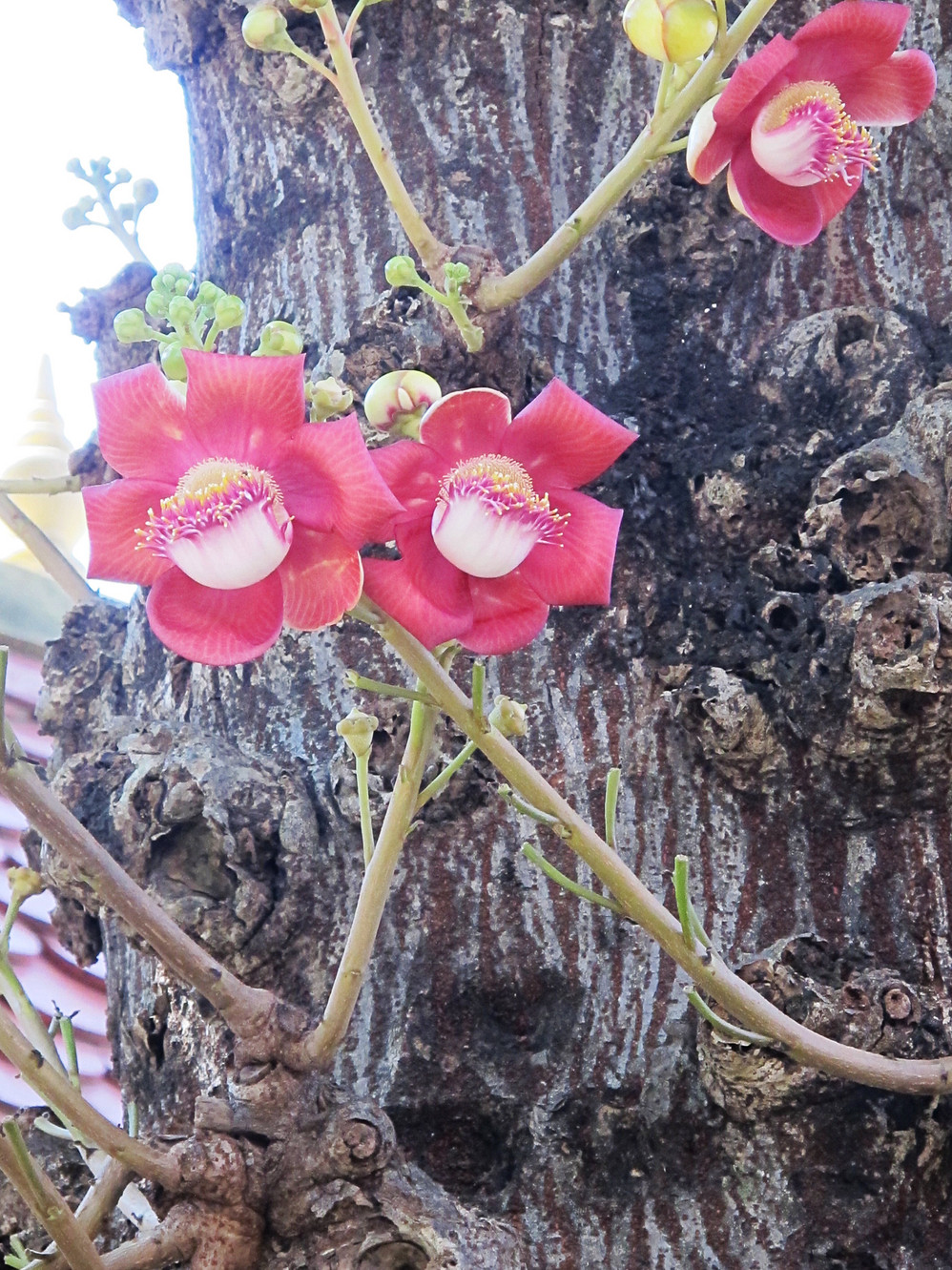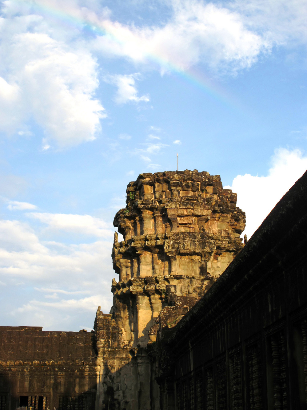 傍晚五时多的时候,我们手脚并用面向阶梯爬下来,已准备返程了,但还是有点不舍,回望澄蓝天穹下金碧辉煌的殿堂,突然发现天际边上出现了一道路彩虹,一刹间这里的一切变得如仙景般的虚幻:眼前是高高耸立的金色尖塔,远处绿茵的草地上三两棵高达十米的笔直棕榈树,护城河那边夕阳映照下淼淼的水光,三角屋檐下农舍旁暮归的牛马在吃草,这里没有汽车喇叭声的喧嚣,没有挡隹视野的高楼大厦,在这里你会忘却物质世界的一切!
