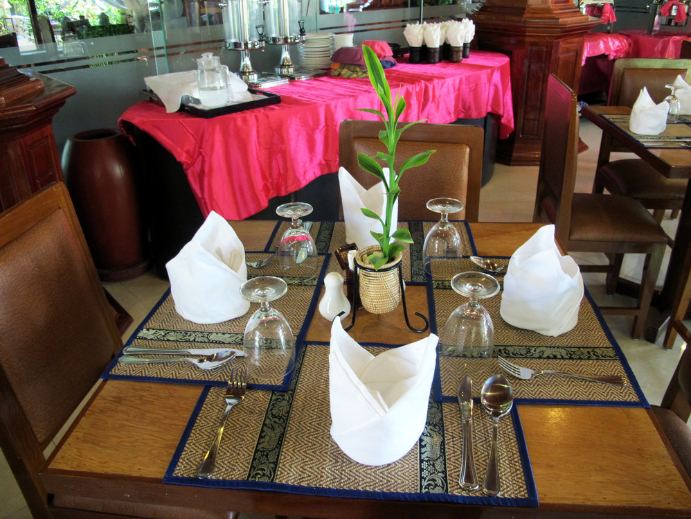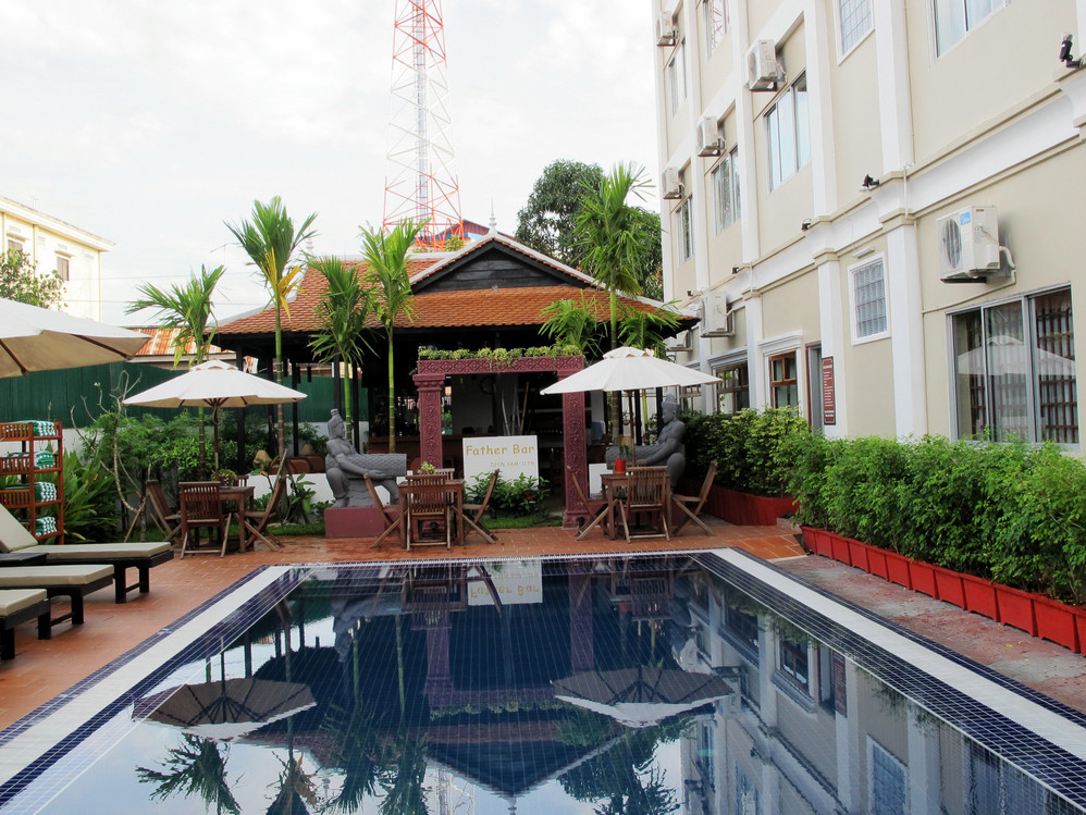 珠的旅馆期望值不高,不过这间妈妈之家酒店真是大大地出乎意外:雨后的傍晚透过酒店小小的玻璃门,一枝水晶灯绽放着温暖的光,推门进去,一股浓郁的香茅草味迎面补来,身穿柬埔寨 服饰的服务生递上了一条白毛巾,服务总台挂着的西哈努克 亲王一家相片,那熟悉的笑容令我们异国的陌生感消除了不少。(24美元/晚,含早餐,小巧但设备齐全,泳池、洒吧、SPA、小小西餐厅,情调诱人!)
