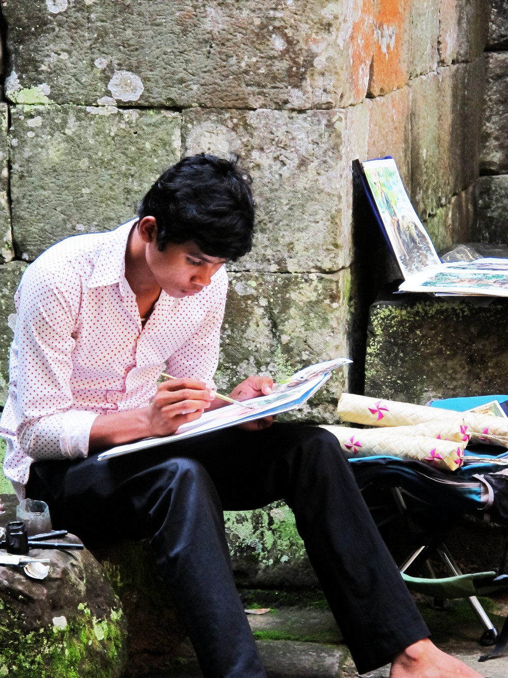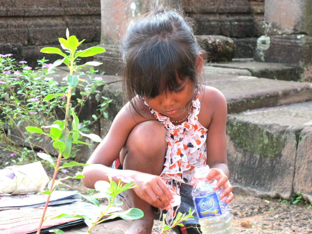 我们在东张西望看景点时,小孩们就会热情地带你去探路,钻门洞,转小径,因没有讲解的导游,他们会告诉你这个是什么景点,还知道你想拍些另类的照片,带你在那个角度拍什么好看,晕!就在这忽悠中,2000Riel就让他们赚了!