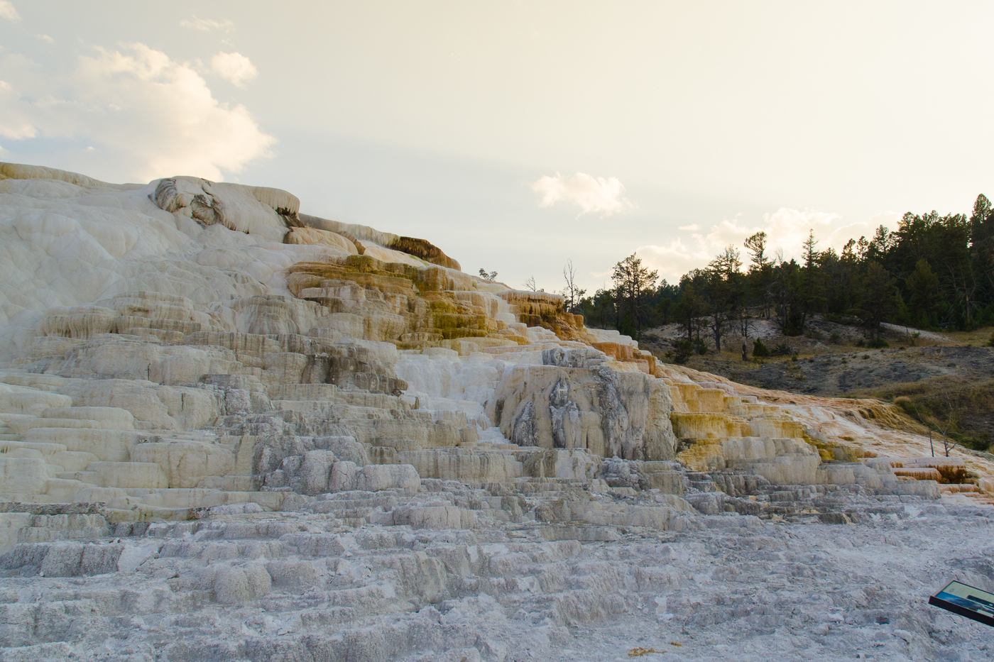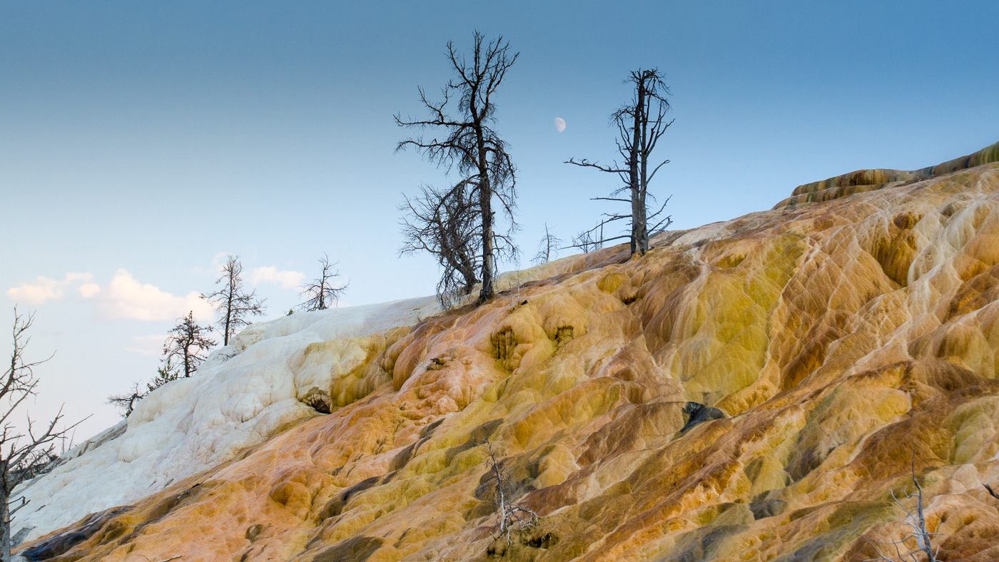 这里是来黄石必来参观的景点,是世界上已探明的最大的碳酸盐沉积温泉,最有特色的是石灰岩蛋糕梯田,死去的黄色和生命的白色再次交汇,空气里弥漫的硫磺的味道,很特别。我们来的时候正好是日落时分,月亮刚刚升起,在猛犸热泉上形成了很特别的风景。