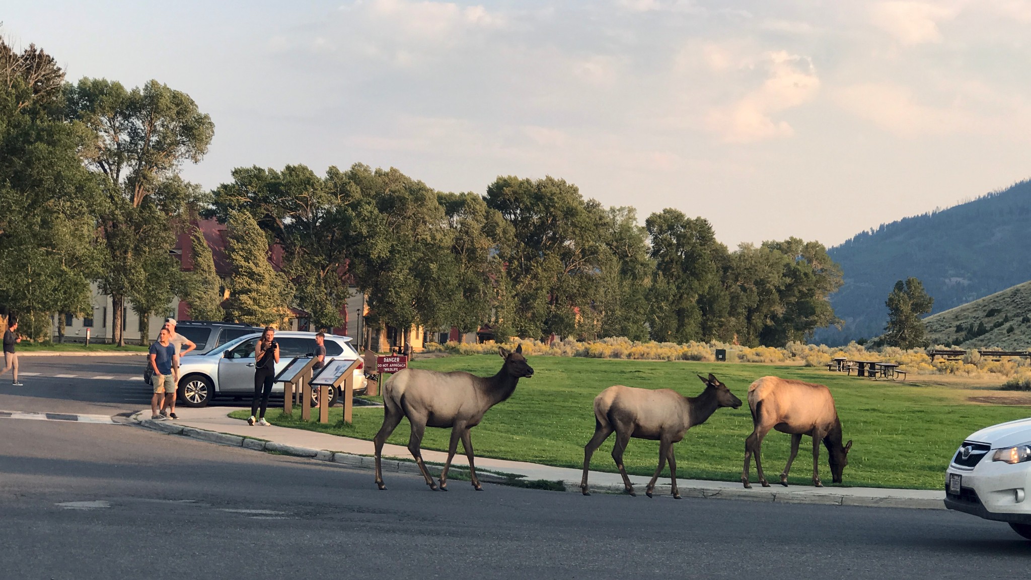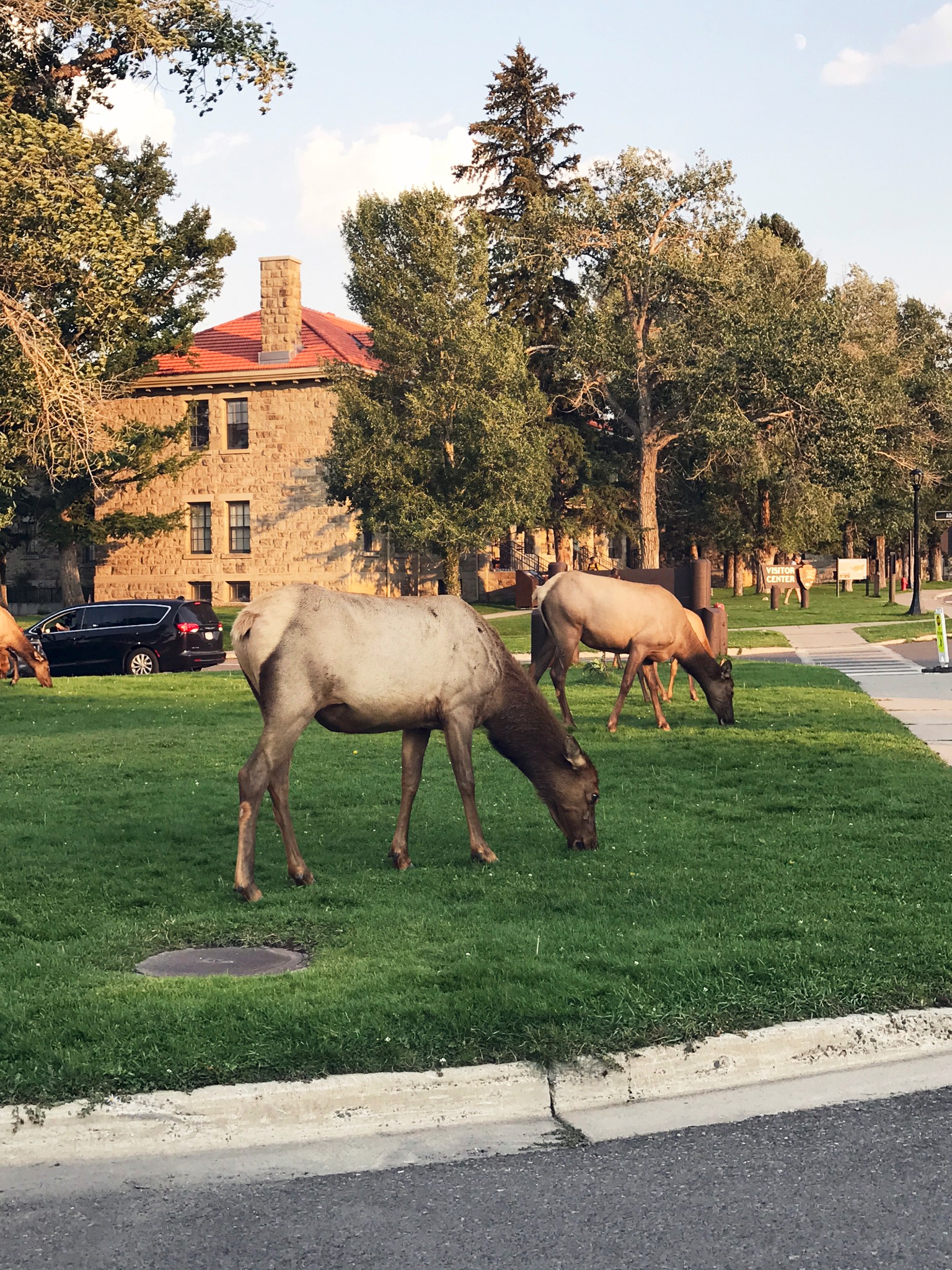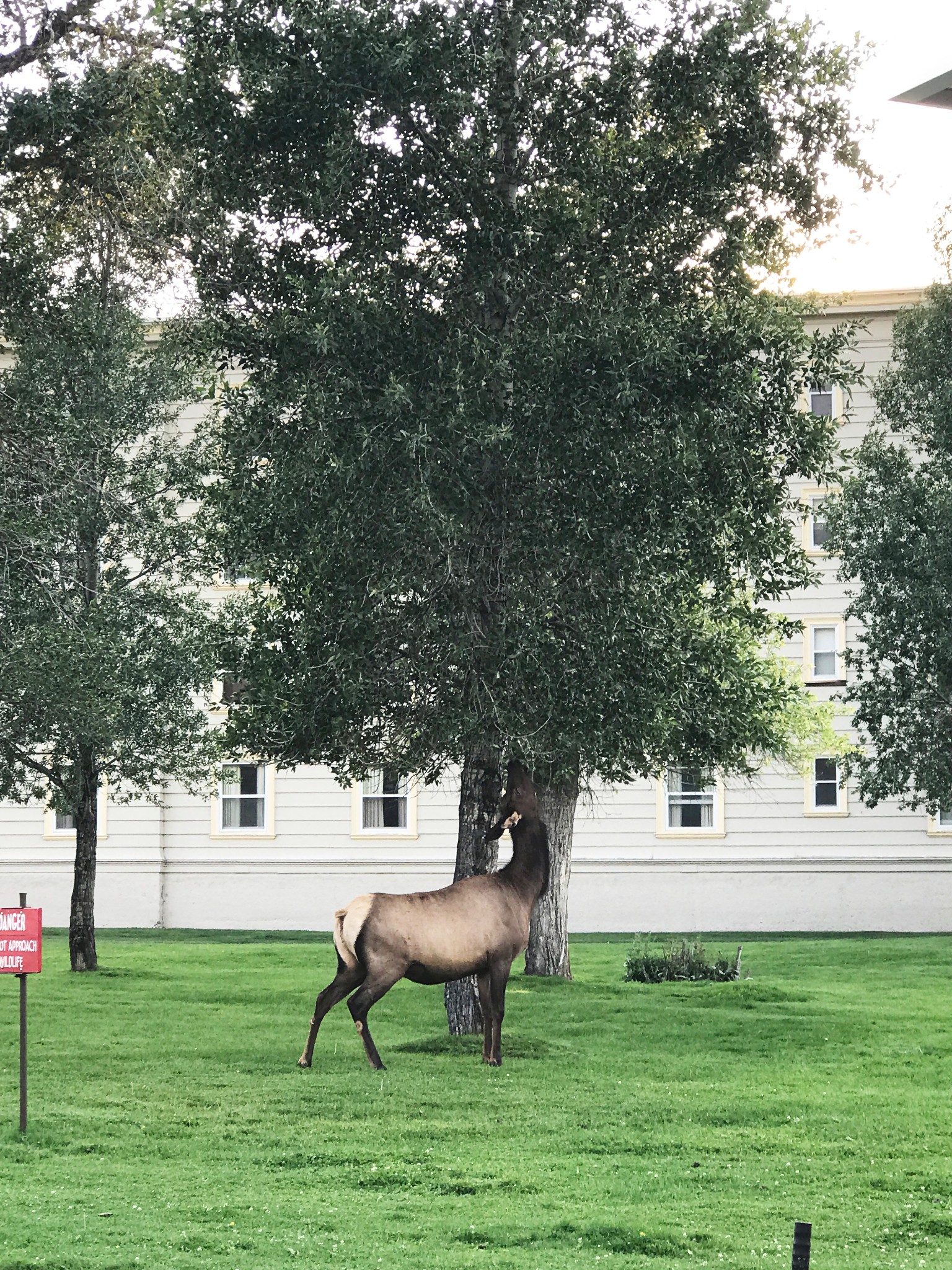 在猛犸热泉我们看到好多完全不怕人的麋鹿,大摇大摆的过马路,吃草,吃树叶,甚至在马路中间摆pose,导致了交通瘫痪了一段时间