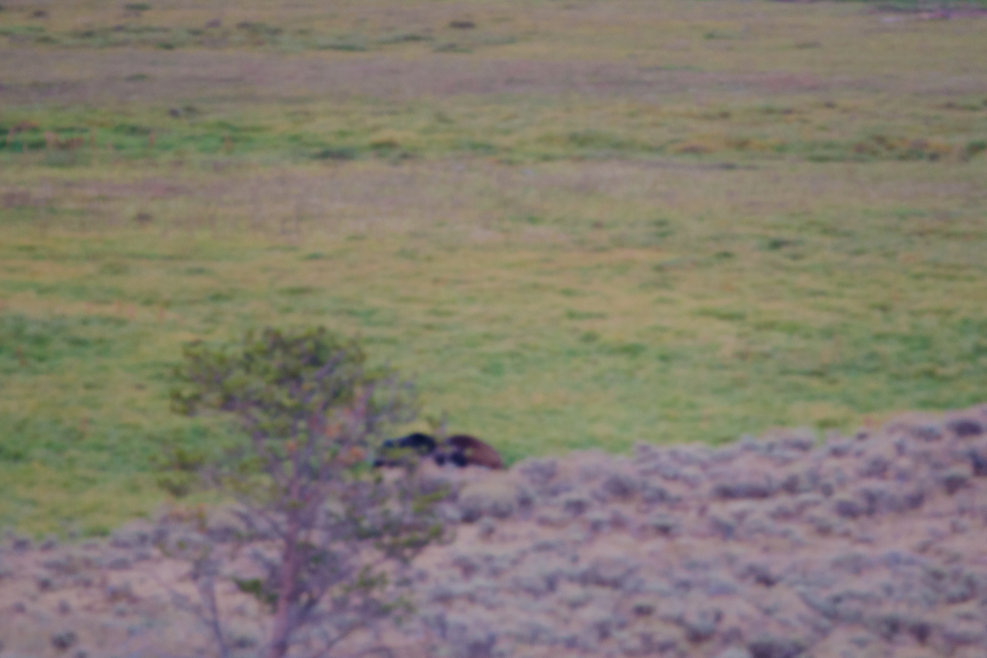 我们正在往露营地开的时候,看到一大群人纷纷往一块草丛里跑。按我之前看到的攻略来说,肯定是有野生动物,尤其是熊或者狼!果不其然,在大概200米远处,有一只灰熊正在享受它的“大餐”,一只死去的野牛,而不远处一只狼正在旁边饥肠辘辘的窥视着,想上去蹭几口的样子。。。