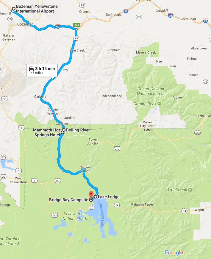 先放一张第一天的行程图,我们是中午到的Bozeman机场,距离黄石公园一个半小时车程,我们先去波兹曼小镇购买了露营所需的食物,水,保温箱,燃气等等不好带上飞机的物资,然后下午四点左右启程去黄石。之所以耽误了几个小时,第一是租车排队排了快一个钟头,第二是前两周美国日全食,大量游客涌进黄石看日食,导致波兹曼小镇很多物资被抢购一空,比如我们小燃气炉需要的butane罐装气全卖光了!我们跑了两三家超市,沃尔玛也卖光了。。。后来沃尔玛店小二指点了一下,说让我去城边的户外用品店碰碰运气,也许还有butane剩余。。。我们赶快开车冲过去!真的在那里买到了!谢天谢地,谢谢沃尔玛的店小二,要不然我们准备的一大堆食物就全得扔了。。。