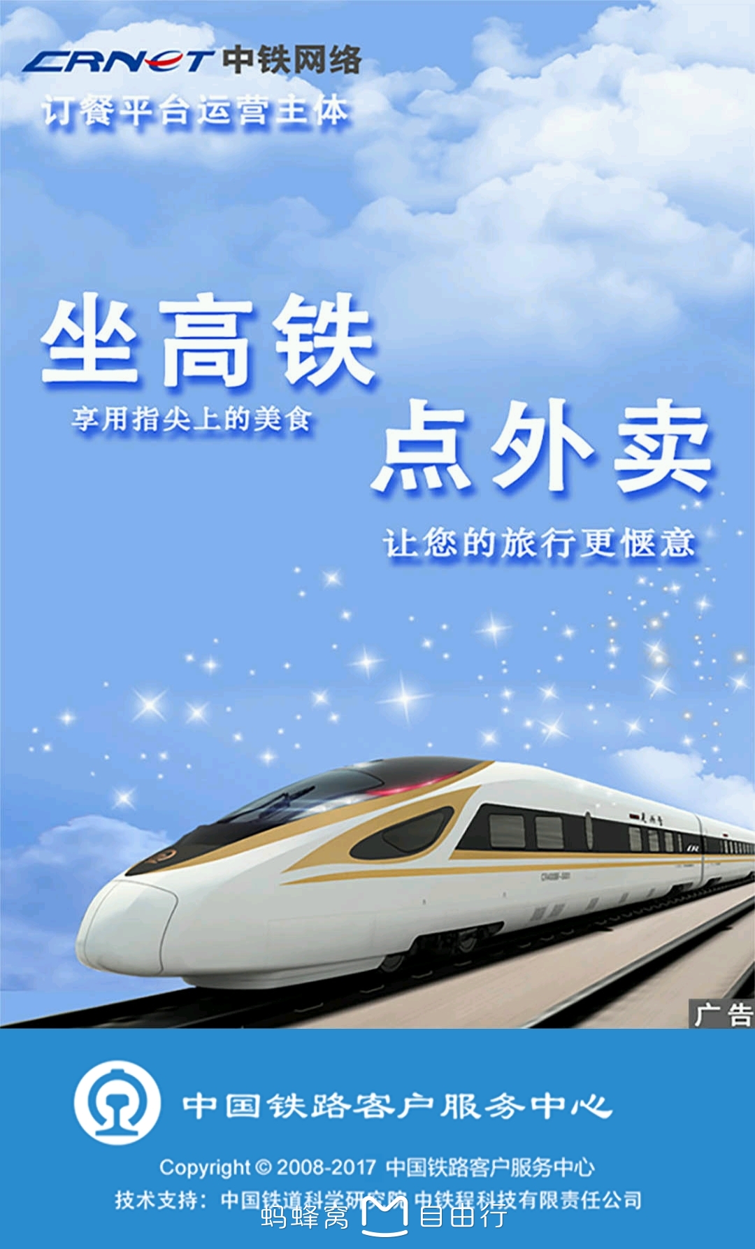打开手机端12306APP,打开的时候就会发现最近的广告都是坐高铁点外卖了!