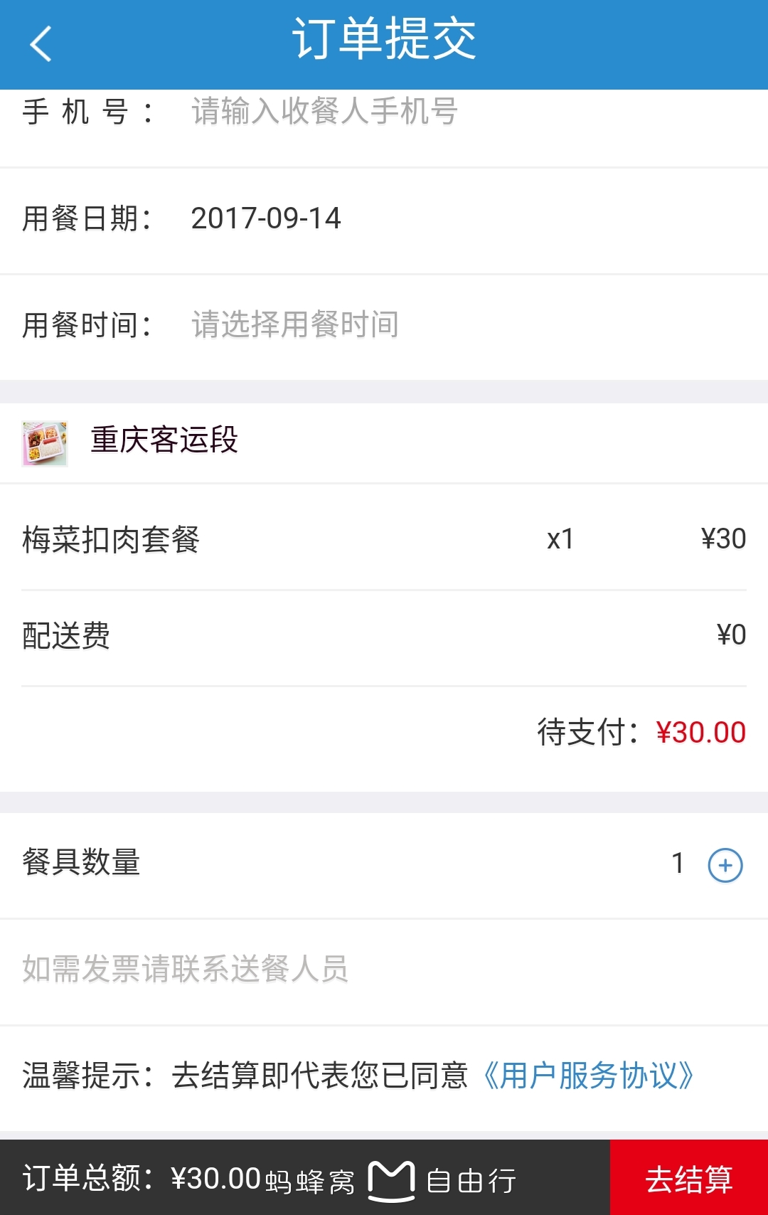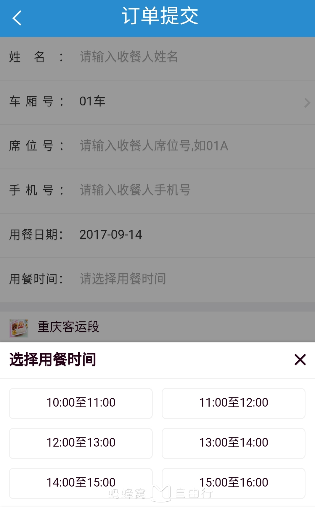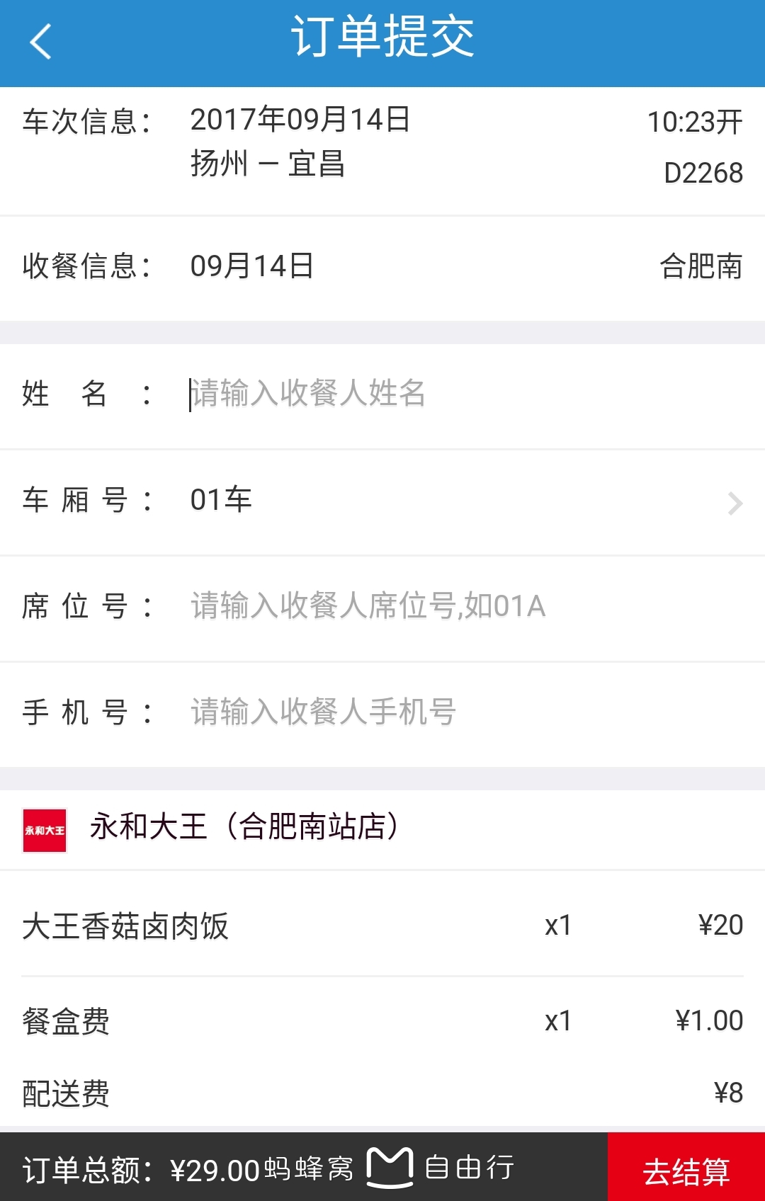 选好餐品就可以进入下一步输入订餐人的信息。填写车厢号、座位号、手机号等信息。填好之后去结算在线支付。铁总的盒饭是不要配送费的,只收盒饭钱!