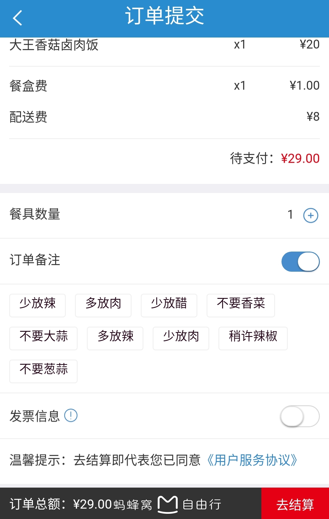 这一步里也有个贴心的功能,就是订单备注!不吃葱蒜香菜,多加辣椒等等的小要求都可以备注起来!