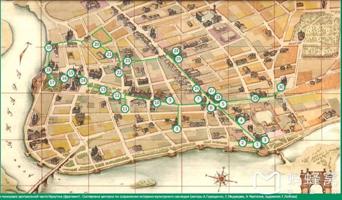 上面地图上画出的绿线以及标出的序号就是伊尔库茨克绿线串联起的30个景点,30个看似很多,其实值得一看的没有几个,当然也完全不必按照序号来走。