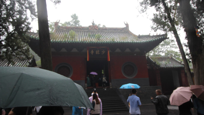 这就是少林寺的山门了。少林寺位于河南省郑州市嵩山五乳峰下,因坐落于嵩山腹地少室山茂密丛林之中,故名"少林寺"。始建于北魏太和十九年(495年),是孝文帝为了安置他所敬仰的印度高僧跋陀尊者,在与都城洛阳相望的嵩山少室山北麓敕建而成。山门为少林寺大门,清雍正十三年(1735年)修建,1974年重新翻修。门额上有清康熙帝亲笔所提"少林",“寺”字则是佛教协会会长赵朴初补写的。匾正中上方刻有"康熙御笔之宝"六字印玺。山门前有石狮一对,雄雌相对,系清代雕刻。