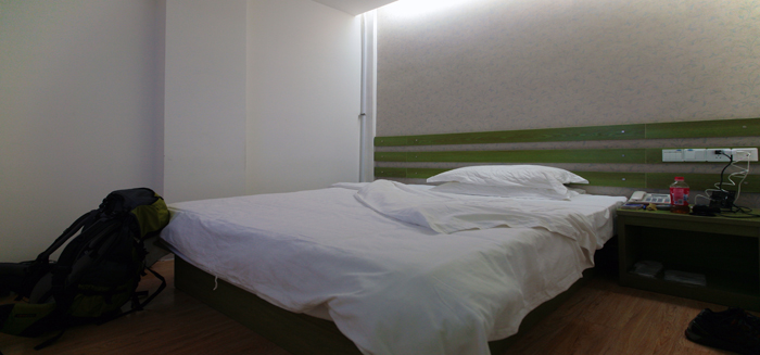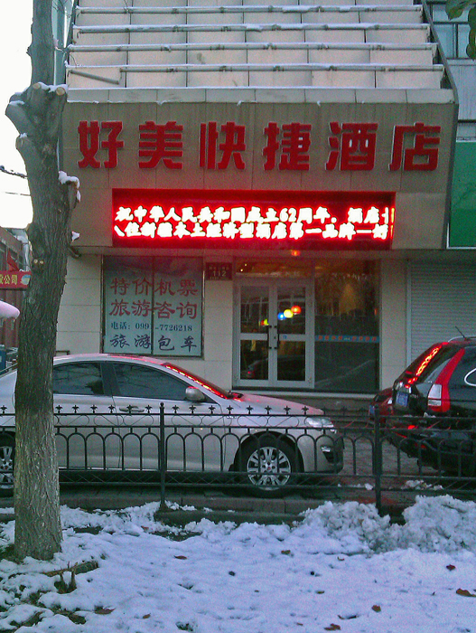 D2: 10月28日, 我就搬至集合地点八楼附近的鲤鱼山南 路112号“好美快捷”医学院店,住地下一层,房价168元,干净、整洁;市内电话、长途电话与上网电脑全有且免费;地理位置也不错,吃与行非常方便(推荐)。