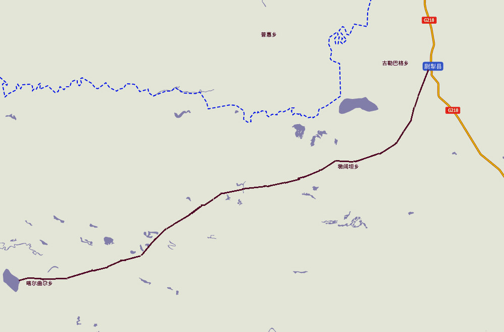 咖啡色线表示:沥青路面与土路(搓板路)相间通往墩阔坦乡和喀尔曲尕乡公路: