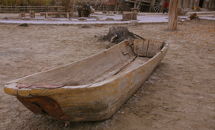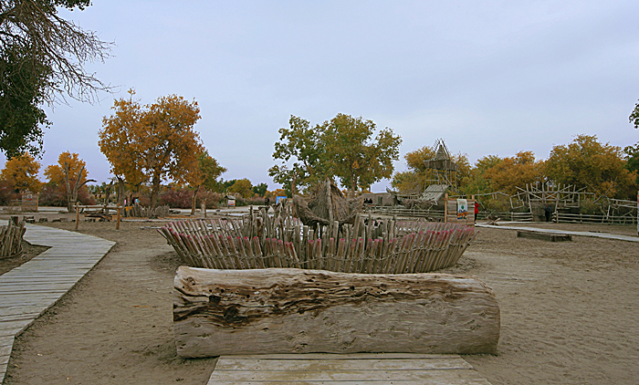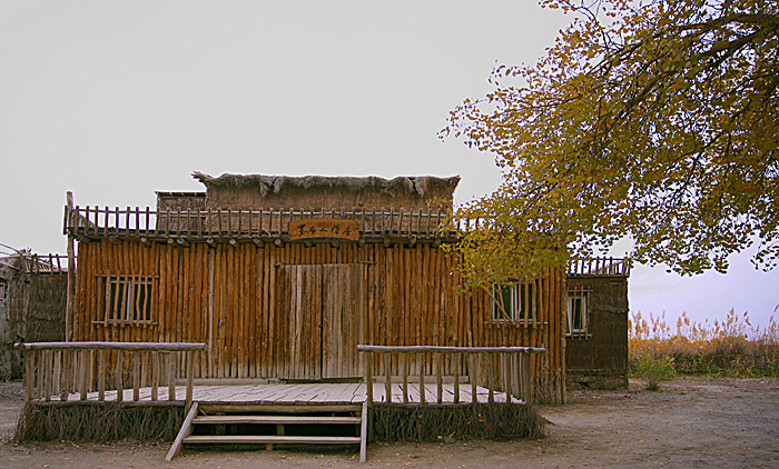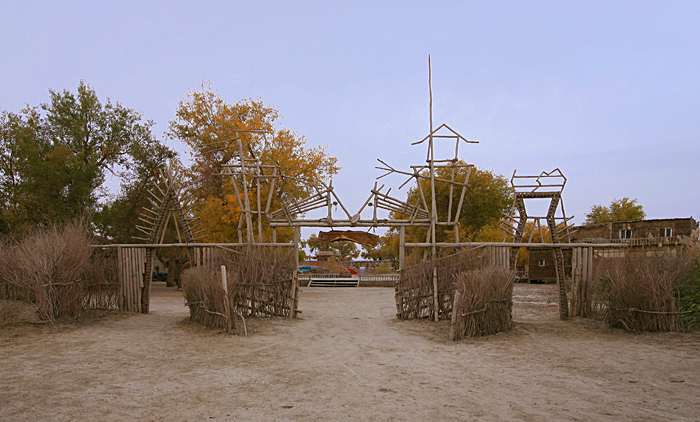 在14点30分到达尉犁 县城,吃拌面10元,半小时后继续上路,赶往“墩阔坦乡”的罗布人村寨,它离尉犁 县城有35公里,那是一段沥青和土石(搓板路)交替的路面,大致在16点30分左右到了罗布人村寨。景区以罗布文化为灵魂,自然生态为基础,是一个集沙漠、胡杨、湖泊和民俗文化于一体,生态环境优美的旅游景区。我国面积最大的塔克拉玛干沙漠 就在景区的南面,连绵起伏,茫茫无边,汹涌澎湃。据说,罗布人是新疆 最古老的民族之一,他们生活在塔里 木河“小海子”边,不种植五谷,不牧牲畜,以小舟捕鱼为食,其方言也是新疆 三大方 言之一,其民俗、民歌、故事都具有特殊的艺术价值。这是一个单一食鱼的民族,丰富的营养使其“长生不老”。但是我看到的都是现代人搭建的民族村,而原来的都已不存在了,就其自然环境还是值得一看,其门票20元。