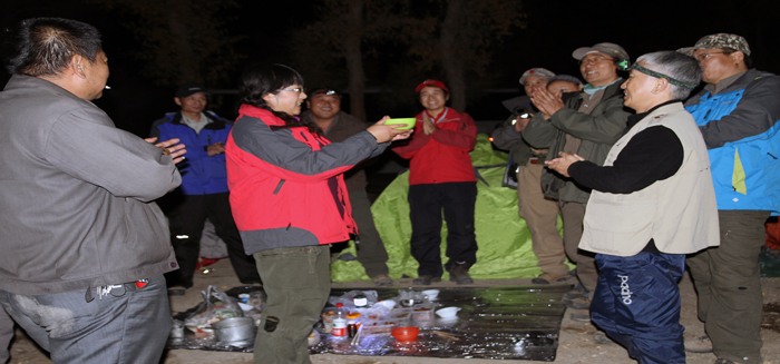 大约在18:30上车继续赶往这次的重头戏"喀尔曲尕乡"也是今晚的落营地。因多云到阴的天气,天色好像暗了许多,路况也不是很好,一段搓板路,仅80公里的路程走了1个多小时,快到目的地时,路况好了许多,是一段泊油马路。那里的通讯信号很差,时有时无,基本上是无法使用。我和另两位驴友,一起合伙扎营,晚餐有自家做的“手抓饭”、酱牛肉、鸡肫、冷拌莲花白、盐菜和玉米粥。吃完后,大家欢聚一堂,唱歌、跳舞、喝酒—直闹到23点才入睡。
