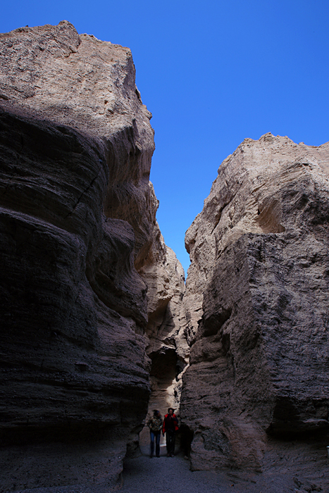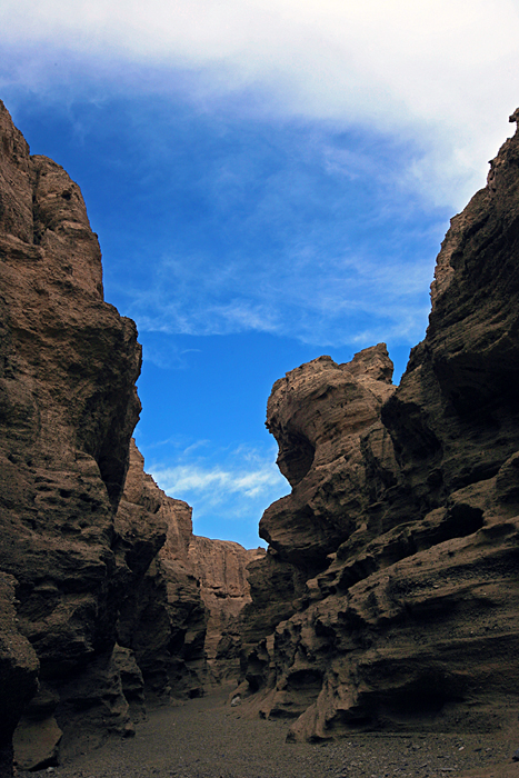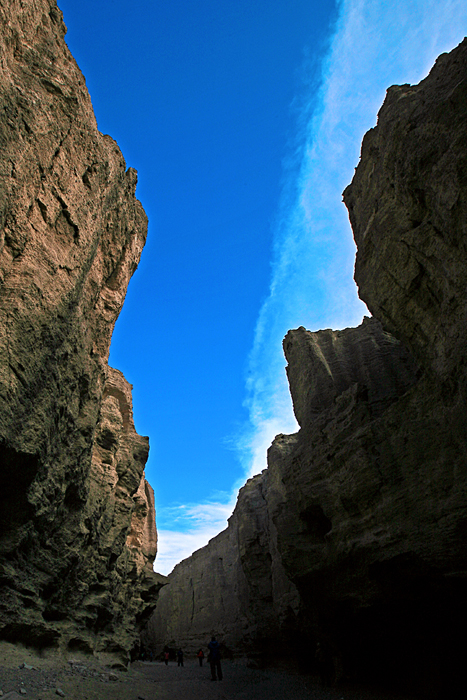而后,回到车上往回走,在12点45分回到尉犁 县城吃了手抓饭(红、黄二种颜色的胡萝卜煮成的饭上面放着一块方方的水煮羊排),我比较喜欢原味、清淡的食物,羊排吃完,饭有剩余。下午1点30分就向“库尔勒 市”进发,罗布泊 地下大裂谷距库尔勒 市58公里,在下午2点30分进入大裂谷,我们是从裂谷的中间下,一边长2100米,另一边2800米,我们选择了较长的—段徒步线路,用时—个多小时来到终点,大客车已等候在此,有一位驴友叫“幸福”的拿了个大西瓜与大家分享他的幸福。