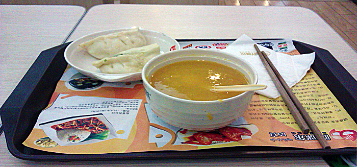 D5: 10月31日,早上在鲤鱼山南 路口,门前开着喇叭忽悠着营养早餐的理念的“吖咪尔”,从楼梯下去一直到柜台,看到三块大牌子食物表,就是点什么没有什么,一圈问下来只有二种包子,于是各要了一个(包子馅是韭菜豆干和白菜五餐肉丁),还要了南瓜粥,反正包子馅怪怪的,粥又不稠,像汤饭(上海 的泡饭)6元撮合一顿。